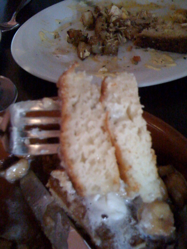 I ended up going for the pancakes – I needed to test their version of a classic (I’m the bad cop, remember?). They came to the table in this round glazed earthenware dish that fit the pancakes just perfectly and were topped with caramelized bananas and walnuts in some sort of syrup. And there was a healthy dollop of cream. They were large and looked fantastic – but nothing looked obviously different than something you might find elsewhere. Then I ate my first bite. Holy … Crap … !! The banana was soft-but-not-mushy and played beautifully with the walnuts. But the heroes of the dish were the pancakes. They had a deep dark color – it was almost like they looked over-cooked, but trust me, they weren’t. They had a nice “crisp-ness” to the outside, followed by the softest, fluffiest interior I have ever seen. And they were super-thick! It was luscious like cake, but floppy like a pancake. Now, I hate the idea of whipping out cameras at restaurants to take pictures of food for the sake of showing everyone else what it looks like – it just feels tacky. It’s clear that I don’t have a problem photographing my own stuff in my own house. But, to be honest, I’d hate it if someone showed up at my workplace and started photographing what I was doing without my expressed permission (wow – they’d be bored out of their mind if they did). Furthermore, I’d be super-weirded out if someone I invited to my dinner party starting photographing my food without asking. But I guess some might feel entitled to do so because the food becomes theirs, as they are paying for it? I don’t know – right or wrong, it just makes me feel awkward. BUT … this one time … I did the unthinkable and asked g for her iPhone. I had to take a picture of the pancakes because no one would believe just how fluffy they are without evidence …