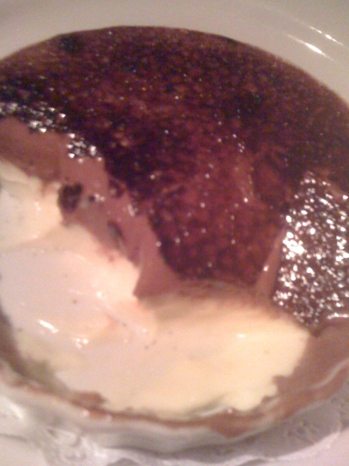 What you see before you is a creme brulee … with a twist. The bottom layer is traditional creme brulee custard, which was creamy and delicious, as the inside of a creme brulee should be. This layer was topped with chocolate mousse, which was then sprinkled with sugar and bruleed. This was awesome. I mean, seriously, there is absolutely NO reason that ordinary creme brulee should ever be offered. However, because not all restaurants are reading this blog and therefore will be unaware that they should make the appropriate change to their menus, I guess I’ll just have to be satisfied with never ordering another creme brulee again unless it comes with a layer of chocolate as Bistro Jeanty has done. In any case, this dinner in its entirety was a superb start to the lineup of amazing dinners that awaited us.