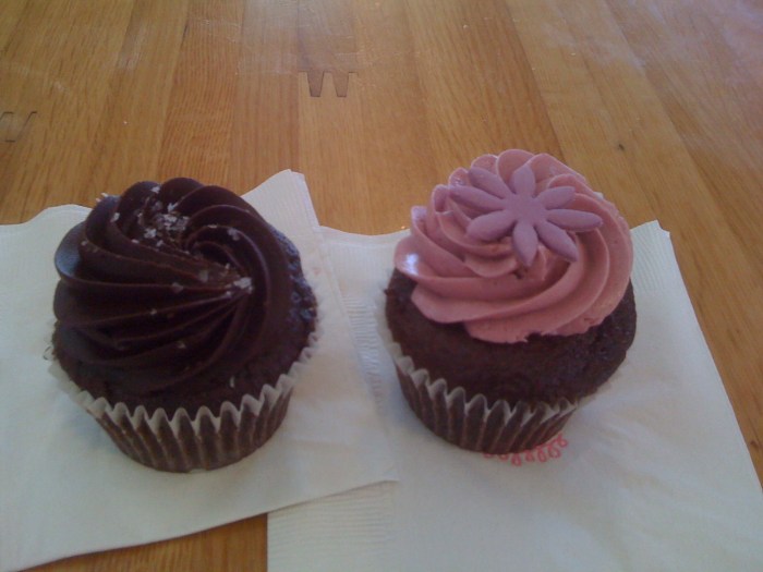 This was the surprise! Kara’s Cupcakes! There is a short-list of things that put g in a better mood … no matter what. They include glasses of sparkling wine, jelly doughnuts, convertibles (with the caveat of good weather), and … cupcakes. But these were more than just cupcakes. These were “the bomb”. The one on the right was a chocolate cake with blackberry filling and cream; g enjoyed it very much. The one on the left was the “fleur de sel” cupcake, featuring chocolate cake, caramel filling, dark chocolate whipped cream (almost like a ganache) and sprinkled coarse salt. I will go on the record right now and say that the fleur de sel cupcake was the single best cupcake I have ever had. Period. The cake was as soft as a cupcake’s cake could possibly be. The caramel filling was perfect. The topping was perfect. But it was the sea salt that made it unbelievable. Brown Betty is lucky that there’s no Kara’s Cupcake here. It was so good that I made sure to stop at another Kara’s Cupcake vendor in SF later on our trip. I ate four of them throughout our stay in California, each one as good as the first. I am now reminded that I should go to the gym, pronto …