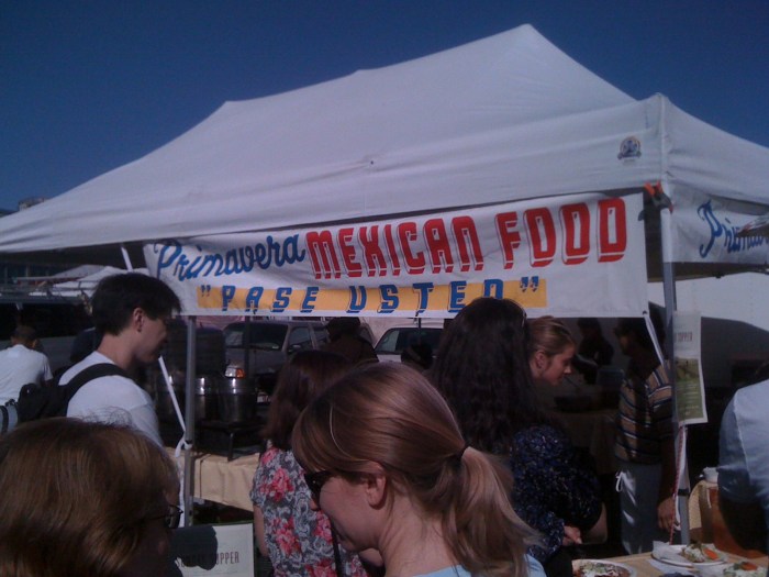 There was this stand there which was run by a small army (family) of Spanish-speaking people (minus the two thin white girls who gave you your food – not sure if they were somehow related, or just the hired eye-candy). There was a line about 6 people deep. And every book on SF food kept talking about chilaquiles – we had never had one before, but we figured this would be a good place to at least find one representative sample. It was actually quite delicious. The combination of egg, tortillas that were fried and cooked in some kind of tomato-based mixture, beans, cheese, and sour cream. Simple, satisfying, and fried – what a great way to start the day.