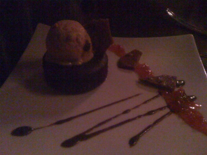 t’s Slops: Venus’s jewel case (a spinach fettucine with bacon in a puffed pastry shell) was a good idea, but kind of a failure – it ended up being a mushy spinach fettucini in a congealed creamy sauce (the bacon was only noticeable if you happened to get a piece). g’s lobster dish was rather unremarkable … which was remarkable because it had lobster in it! The bacon budino dessert (pictured above) was good in concept (bacon brittle, chocolate budino, paprika ice cream, chile jam), but the balance of flavors was off – please turn down the paprika and turn up the bacon (stick it in the ice cream!). Also, in my opinion, the chocolate budino was not a budino (unless I am mistaken about what a budino is, but google suggests I am not). Had the budino been as awesome as I imagined, the title of this post would have been “James’s Barbuzzo Budino Killer”.