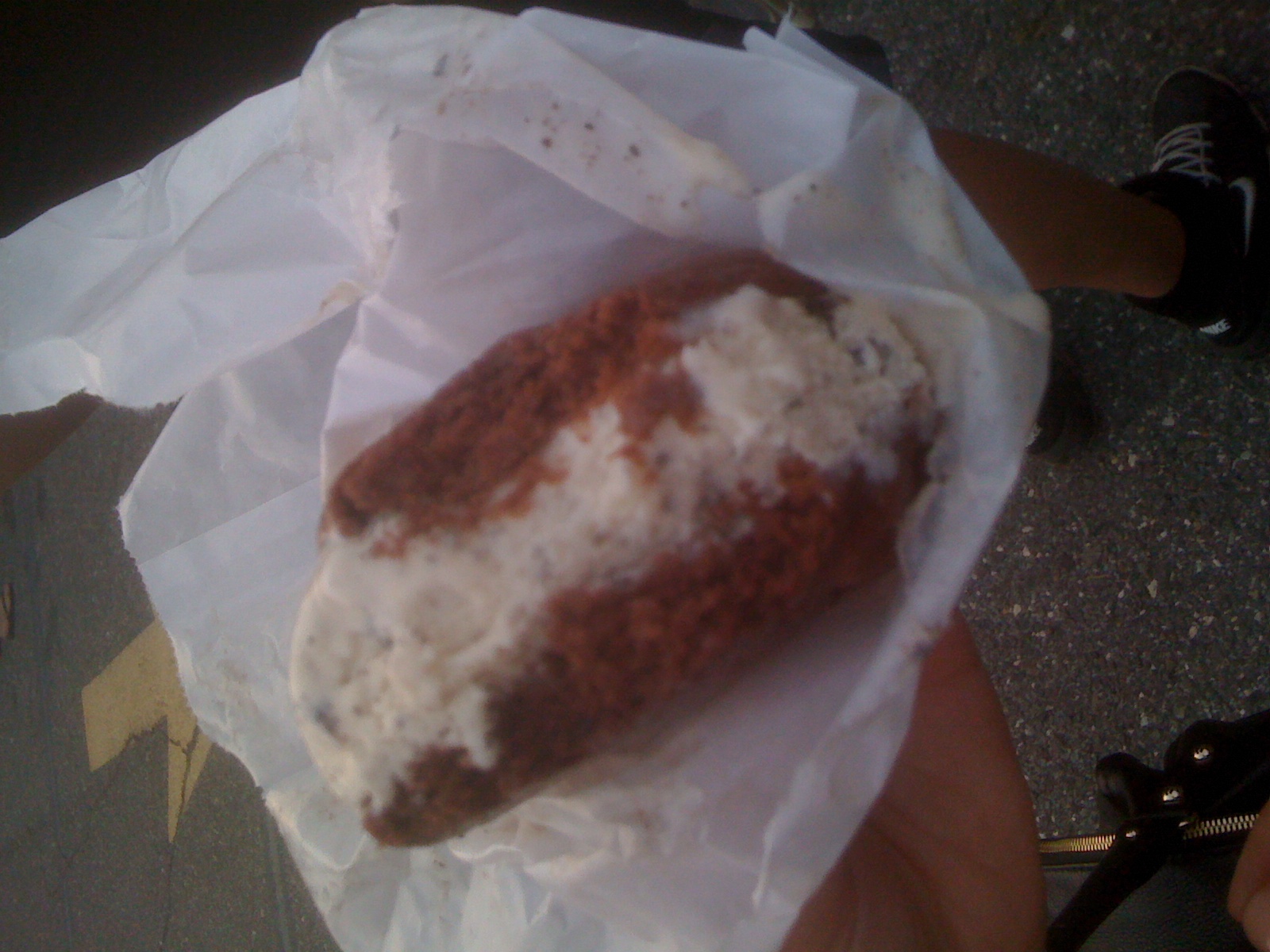 And right as I received our tacos, it started raining. Booooo. I eventually located the rest of the party and we began to consume our foodstuffs. The pizza (?from Nomad Pizza?) wasn’t bad – not superb, but happily identifiable as “good pizza”. The tacos, to be honest, were a little of a letdown. g suspects that this is because we weren’t taking the time to savor each bite (as we were getting rained on and itching to get a move on). I suspect that it’s because the flavors were kind of muddled. I had a bite of the mushroom and chicken tacos and the entirety of a short rib taco. The two meat ones were dominated by their sauces. The short rib one was overly sour-cream-esque (I actually can’t identify what the major component of the sauce was – but it was white). The mushroom one was probably the best, with some good texture and brighter vegetable flavors. But regardless of which one, Tyson Bee’s totally blows guapos out of the water – the flavors are stronger, the textures are more variable. Hell, they even have a larger variety, from buns to tacos to burritos to curries – I’m glad that they’re close by to where I work. Sorry I didn’t have any pictures of the tacos, but my hands were too covered with taco shmutz to bother with fiddling around with my iPhone.