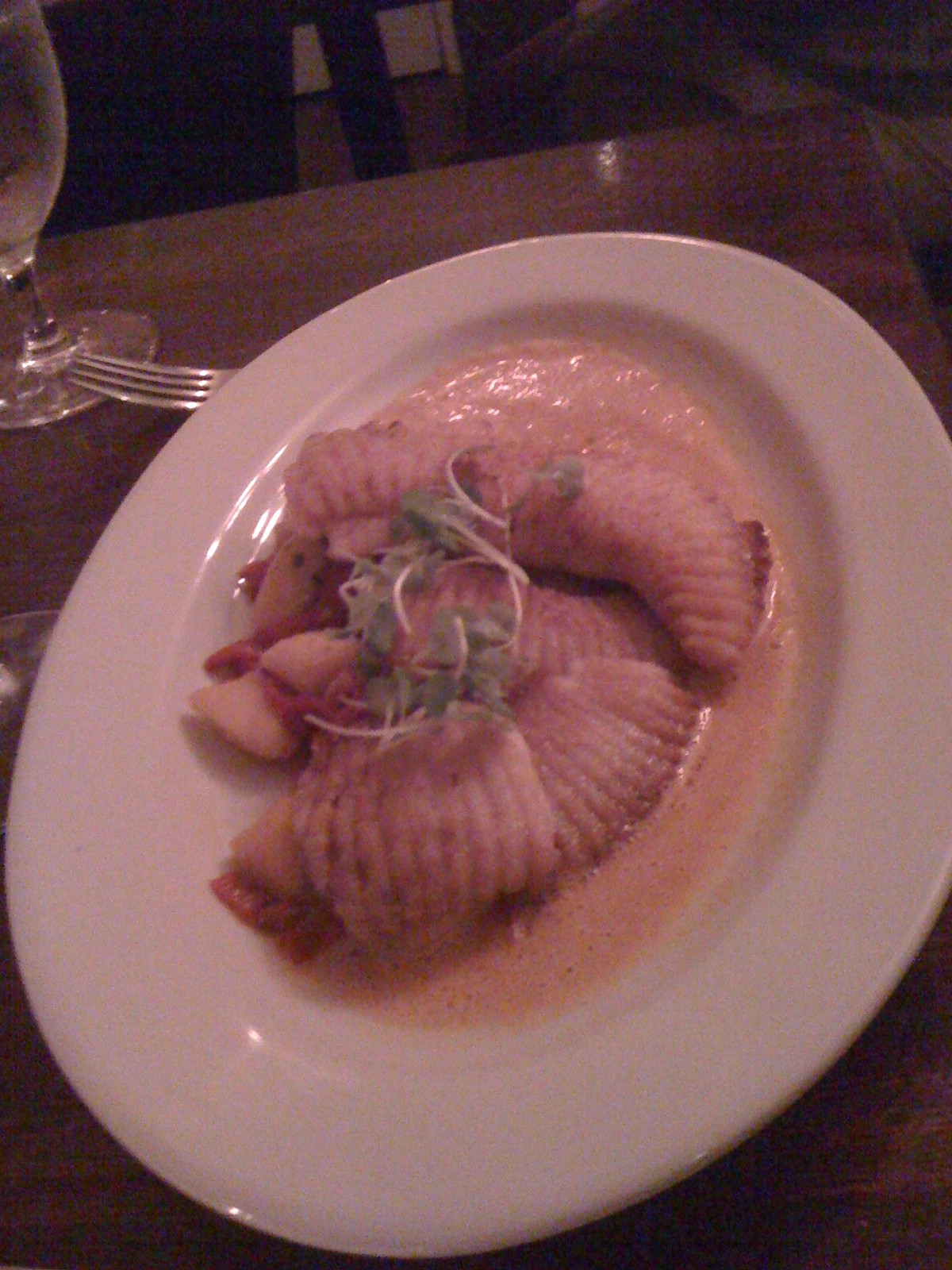 I ventured the “special” terrine appetizer. I will say simply that this is the best thing I ate that night and easily the best terrine I’ve ever had. Of course, it has the distinct advantage of being a warm dish, whereas most terrines I’ve had have been cold (I like warm dishes). For some reason, my notes indicate that someone said, “The heat is broughten”. Apparently, the terrine was so good that we felt obliged to violate some fairly basic rules of grammar … It actually defies description, so I’m moving on …
