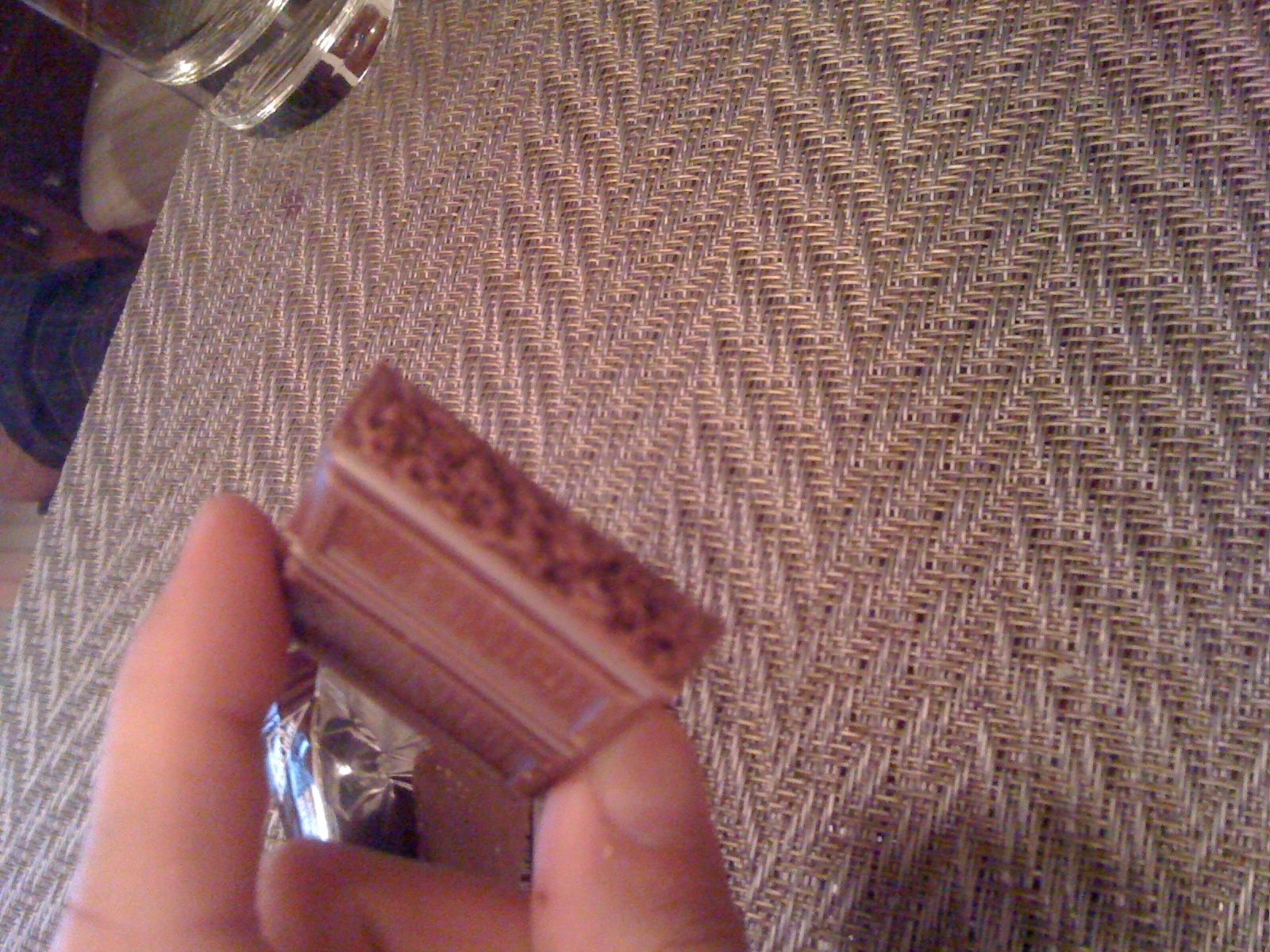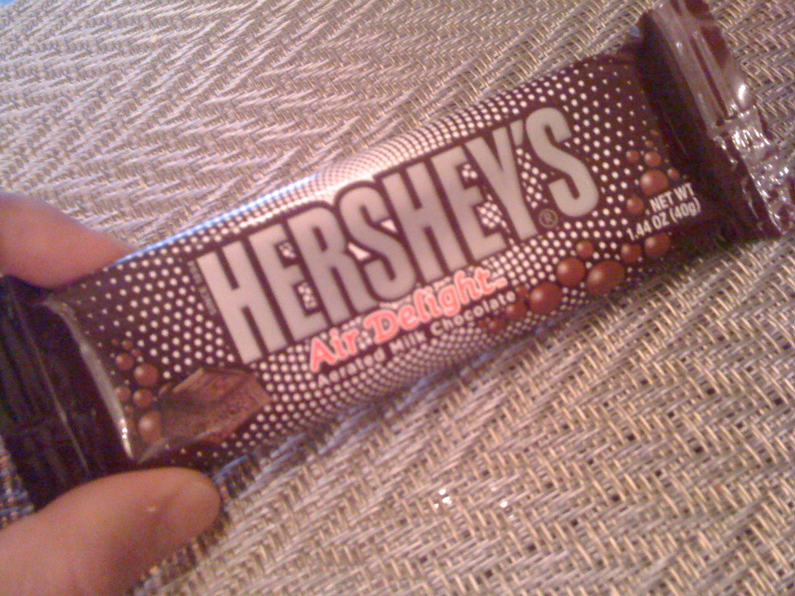 Ok, so the pictures turned out horribly (can’t wait to get my hands on an iPhone 4S), but I can at least tell you what it tastes like. It tastes kind of like a cross between a classic Hershey’s bar and 3 Musketeers nougat filling. It’s definitely lighter/creamier than a classic Hershey’s bar (but still has that Hershey’s “taste” – i.e., it doesn’t taste like chocolate … it tastes like “Hershey’s”), but it’s not sticky/liquidy like nougat. That said, I kind of think the Flake bar did a better job with aeration as that felt even fluffier than the Air Delight – it felt more fragile, more elegant. I’d say that comparing the two is kind of like comparing a Tempurpedic mattress to a $50 knock-off – they’re both trying to do the same thing, but there’s something about the original that just feels different. Would I ever buy it again? Probably not. If I’m having a hankering for chocolate, I wouldn’t eat Hershey’s. If I’m having a hankering for Hershey’s, then I’m going to go for the original.