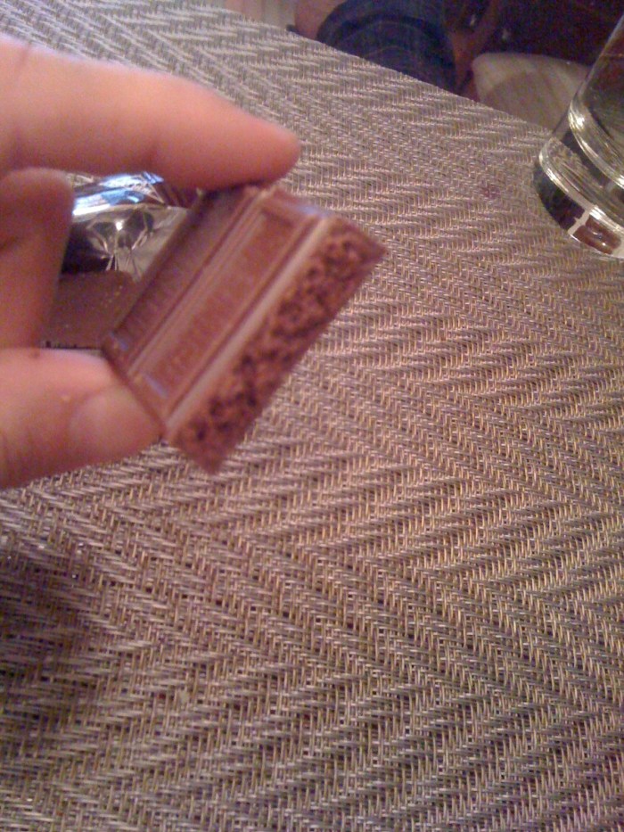 Flash forward a month. g saw those commercials for some Hershey’s product that was “aerated” so it had lots of little air pockets. I think she said, “what the crap is that? That’s so weird!” I reminded her that I had encountered, eaten, and written about a Cadbury “Flake” bar that had a similar concept: a chocolate bar filled with air. She had forgotten. I had not. Score 1 for team t. I had also encountered one of these “Air Delight” bars well before the advertisements were on tv and I took pictures of it. Then I forgot. Well here they are.