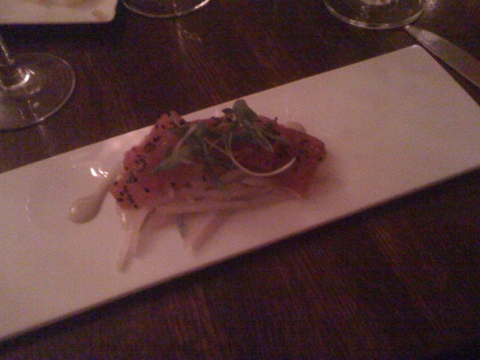 t says: I went for the tuna crudo. Shocker, I know! We had a nice white, so I eschewed the escargots I normally go for in favor of the fish. Take a peek: