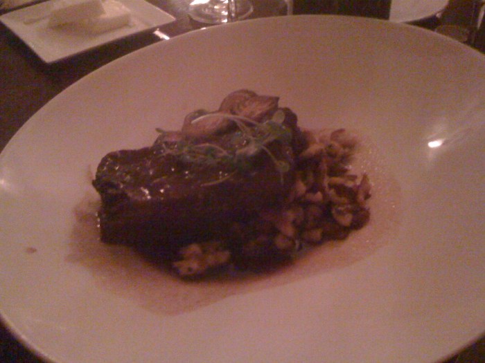 The shortrib was g’s dish. I had some. HOLY. CRAP. I haven’t had a shortrib this good since the slab of shortrib included in Talula Garden’s beef duo. It was fall-apart-tender and glazed in that rich thick sauce. I can’t tell you what was in it, but what I can tell you is that if I go back, I’d actually not be able to choose between the shortrib or the PORK BELLY. But of course – there are worse things in life than being forced to choose between the two. I don’t recall the accompaniments (?Brussels sprouts? ?onion spatzle?), but like the PORK BELLY, I don’t recall there being much counterpoint to the rich lusciousness of cow meat.