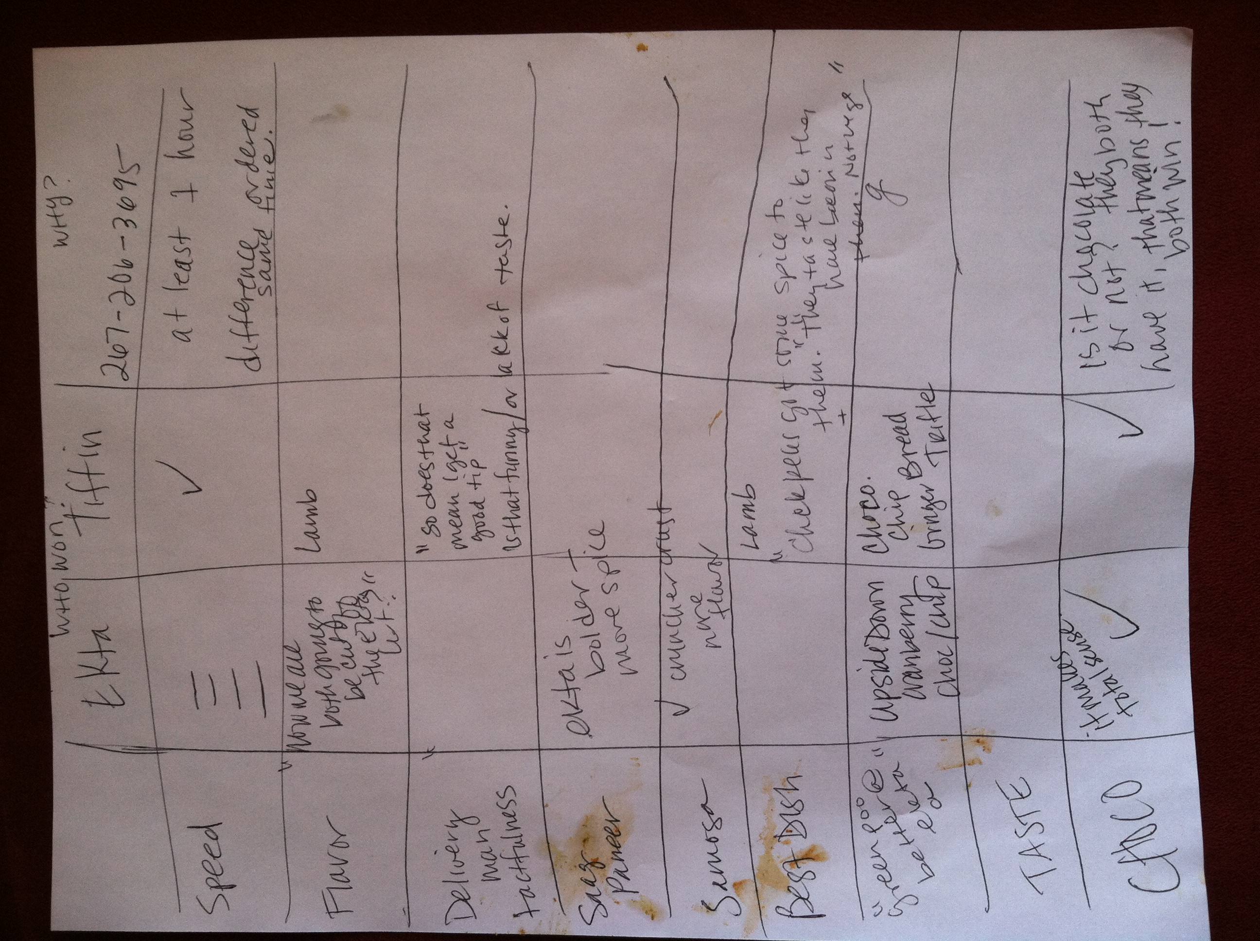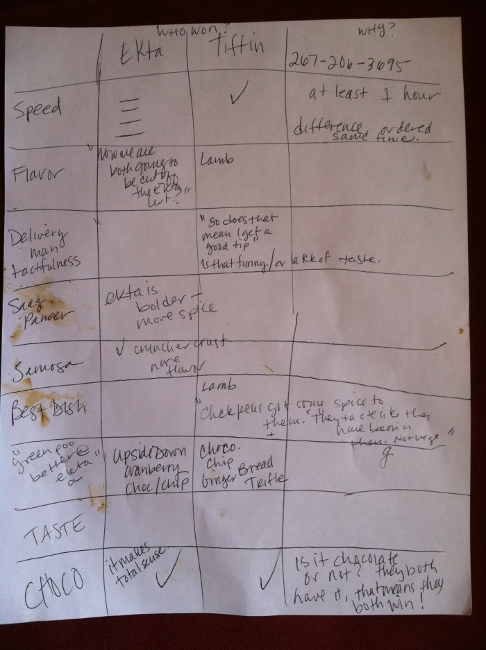 Delivery guy tact/competence: When we told the Tiffin delivery guy that it was a competition and that he delivered first, he asked, “so does that mean I get a good tip?” While we’re sure he was just being playful, it could be construed as kind of tactless. Meanwhile the Ekta guy was very humble/apologetic, which we appreciated – but does that make up for not even attempting to call us. We’ll leave it a draw or give Tiffin the edge (I favor competence over tact).