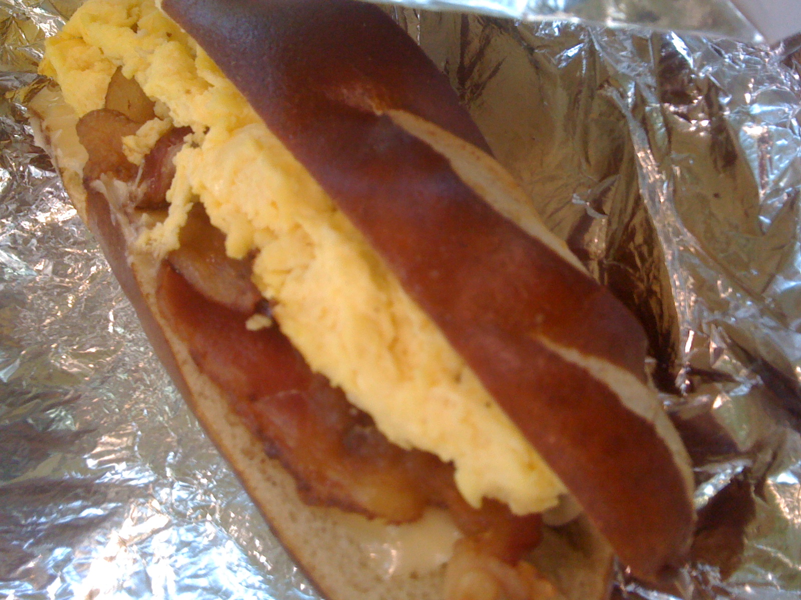 bacon+egg+cheese+pretzel roll. And you thought a bacon-egg-and-cheese biscuit was good? Not after one of these. AND, because it's pretzel instead of a biscuit, it's healthier, right? Riiiiiight.