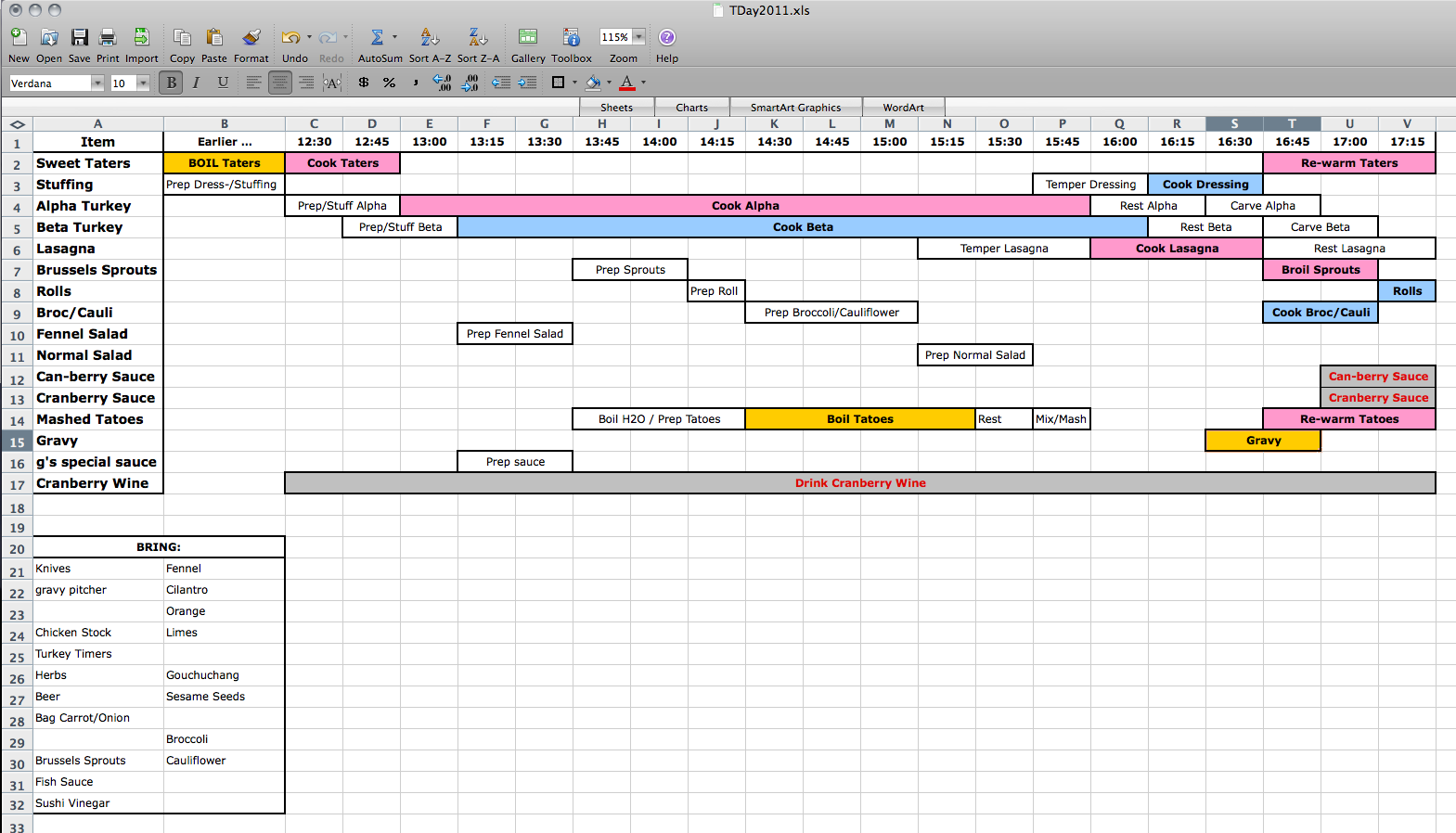 t says: g and I normally cook up a storm for Thanksgiving at my parents’ house. This year was a little different, as we did a lot of cooking at her mom’s house. While I just hate to toot my own horn, I have to say that the food turned out pretty darn good. g’s mom and family took care of the classics (mashed tatoes, sweet taters, dressing/stuffing, lasagna), while g and I took on the remainder (forcing everyone to enjoy new-to-our-Thanksgiving additions of cauliflower, Brussels sprouts, and fennel salad) and coordinated the cooking schedule. What does that mean to “coordinate a cooking schedule”. Let’s just say that I run a tight ship – a dictatorship (buzinga!). See what I mean: