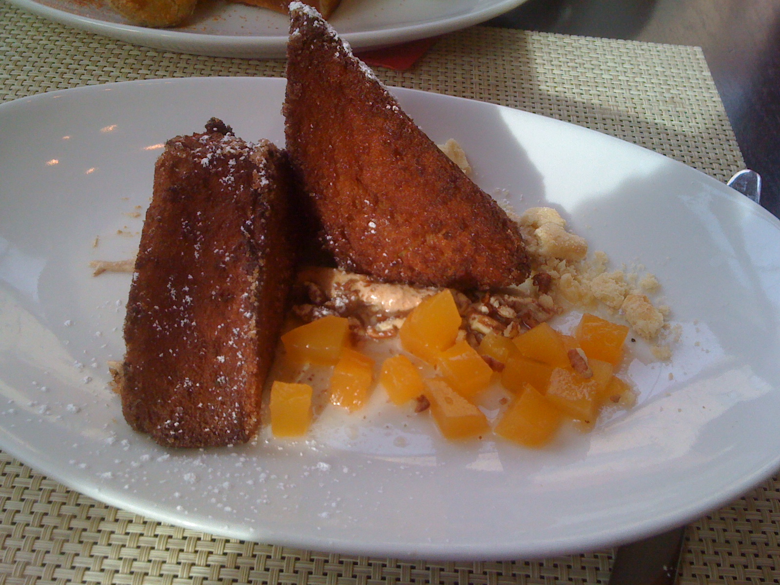 The dish came out and I was ecstatic. It looks awesome, right? Sure did! Unfortunately, something about it just didn’t deliver. The spiced cream was very subtle – mostly because my brain kept wanting it to taste like pumpkin, but it didn’t (that’s probably my brain’s fault). The pumpkin, itself, didn’t really have much oomph to it, either, adding more of a textural element than any real “pumpkin”. And the pie crust was just that: pie crust. Actually, the crust crumbles were a little on the anemic side – more like the pie crust on the bottom of a piece of Pumpkin pie and not that fluted edges that get brown and tasty. So basically, I was left with the French toast as the main harbinger of flavor (with maple syrup, of course). Normally, that’d be ok, as I’m a sucker for egg-dipped bread. In this situation, however, the bread, while browned to perfection, suffered from the same fate that Distrito’s French toast had in the past: too heavy/oily/fatty. It’s the kind of thing that you bite into and immediately react, “whoa, that’s rich” … which is surprising because it’s not a piece of PORK BELLY or chocolate cake – it’s French toast! It’s most certainly a side effect of the cooking process and likely intentional – some will love it and some will hate it. After the first bite, I kind of hated it. To illustrate just how overwhelming this sensation was, I only finished one of the slabs, and the other one I opted to not take home (and I normally take everything home). Yea, that’s some serious aversion. So in the end, what I had was some exceedingly unctuous French toast but not a a single thing to take the edge off of the richness (n.b. the toast, itself, didn’t really bring much to the table – it was more like a vehicle for fried-ness). Damn.