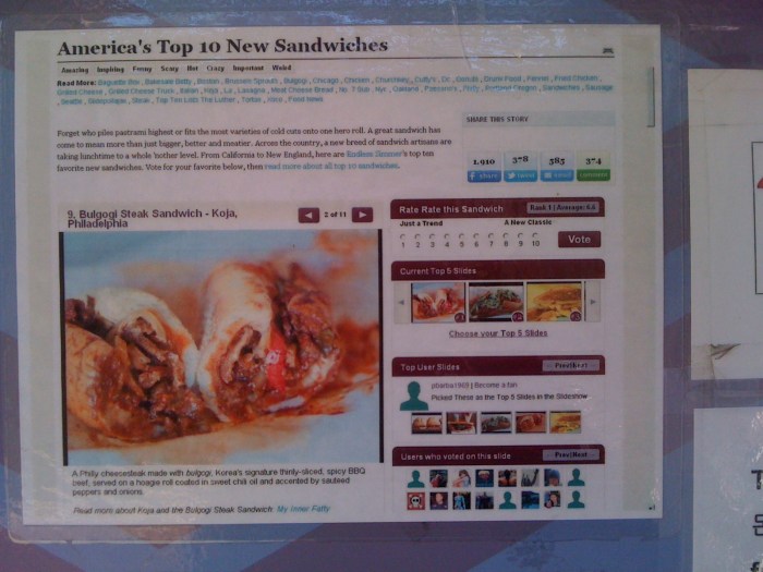 As I was walking by Koja’s truck (it’s got some pretty bright colors), I was distracted by their advertisement of a “America’s Top 10 New Sandwich”. Check it: