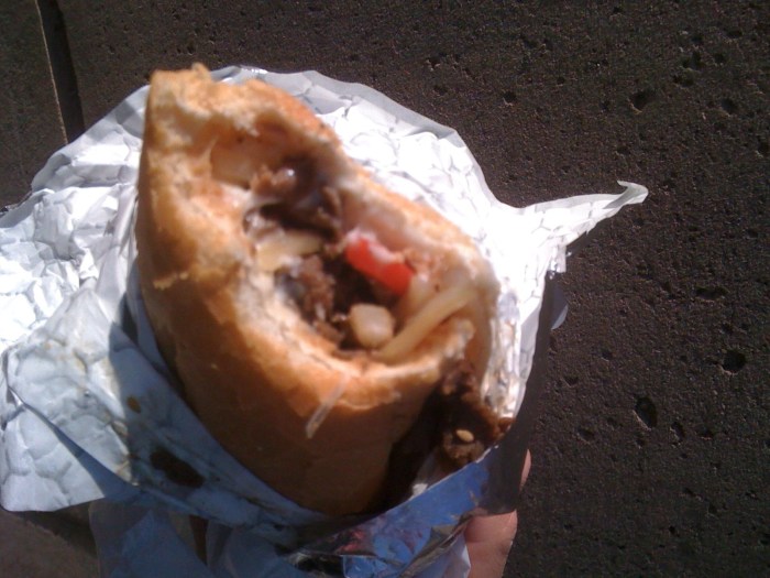 The next thing I needed to do was to find another Korean-inspired hoagie. I knew just where to go: Tyson Bees. But there was one problem. Actually, there were two. The first was that they discontinued the steamed pork buns – a favorite of mine, even if the quality of the product had gone down substantially since the truck changed owners (it was never as flavorful as it used to be, but still pretty good for $3). They did, however, have a Korean bulgogi burrito. I’ve had it before, but this time I asked them to put the filling onto a hoagie roll. They did, no problem: