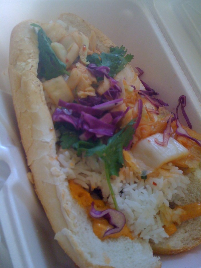 Tyson Bee's bulgogi burrito on a hoagie roll = steak + rice + special sauce + kimchi + other stuff + cilantro
