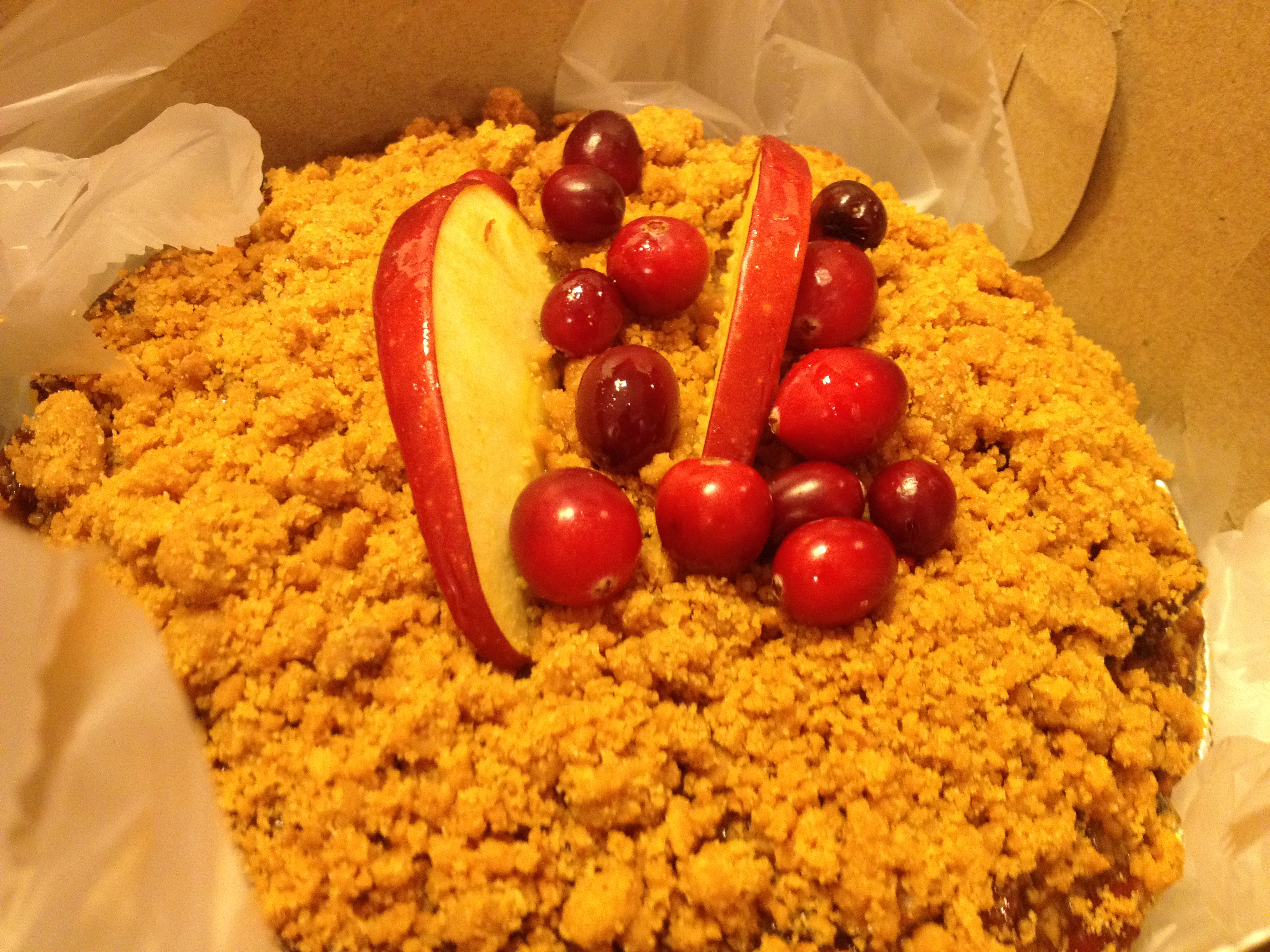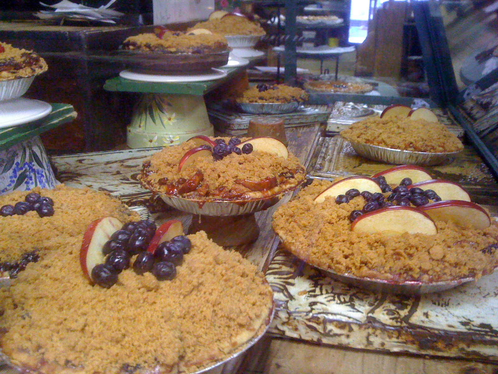 As you can see, the ingredients that are on top of the pie identifies the kind of pie they have. In the past, we’ve had their pumpkin pies (and pumpkin ricotta pies) which are fabulous. g’s fave might be the “multi-fruit pie” which has basically every berry that’s in season. We’ve done apple-blueberry, strawberry, plain apple. All fabulous. My personal favorite is the one I bought most recently (and the inspiration for this post):