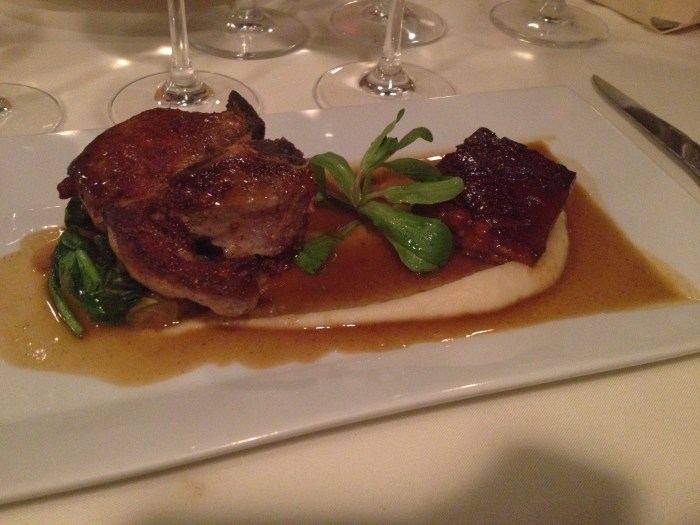 What you see in the above pic is a duo of pork. I eschewed the pig’s foot and the beef in favor of this “special” which included [essentially] a T-bone of pork and a slab of pork belly. Yes, there were greens and a root puree. But I need to draw focus to the pork belly. Now, my favorite pork belly has long been Lee Styer’s at Fond. This one is nothing like Lee’s. There’s no dense crust. The portion is fairly petite. But the flavor! O! M! G! (Don’t you love it when I do that?) The flavor! The rich fat disintegrates in your mouth instantaneously, letting out a deeply piggy flavor framed in such a wonderful sweetness, but not in a cloying way. And it just keeps going. I was brought to silence, and, had I had enough wine, perhaps a single tear could have escaped from my eye. It was so beautiful. It was like seeing a baby being born (except that I don’t proceed to eat the baby). And in that instant, Pierre stole the crown from Lee. It. Was. Epic.