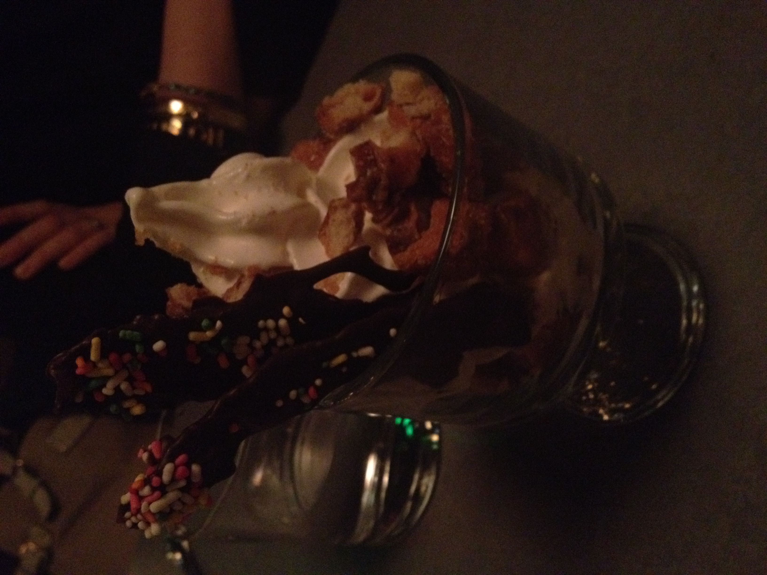 This dessert turned out to be a little hokey. Those chocolate stick-looking things were chocolate-covered bacon … so there was no bacon anywhere else. Boooooooo. The rest of the sundae was unremarkable. This kinda made me sad – I think I might have pouted a little.