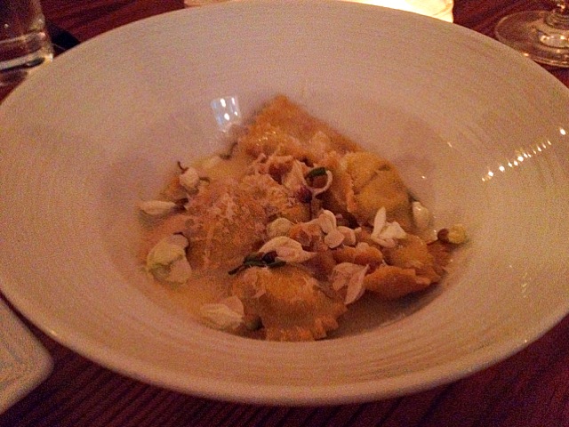 When we first got there, we told the server that it was our first time and asked for recommendations. She explained that “anything pasta” was bound to be good, as all the pasta was made fresh in-house. Immediately, I eyed a shortrib ?pappardelle? – as I’m a sucker for shortrib. But that’d be too normal – I wanted to see chef’s chops. So I changed tunes at the last second and went with the ramp ravioli in what I think was a lemon-butter sauce adorned with some sort of petals (I should have read the menu more closely – they’ve since changed the menu so I can’t even look it up). Whatever it was, this dish was FANTASTIC. All four of us agreed that the combo of flavors made for a ravioli that was bright and summery – there’s just something about the way the ramps came through on the palate, presumably unleashed from the filling. Splendid ravioli texture, too! Someone knows how to make some pasta!