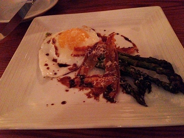 Our friends ordered up this app. From what I can tell, the execution seemed spot-on, however, it was pretty small for costing close to $10. I only sampled the bacon, which in my book was perfectly crisped. Sorry – I can’t comment past that. Overall, it seems that our friends were happy to taste/eat the food, but I still wonder whether even the most perfect of preparations of an egg, some asparagus, and bacon could ever warrant so high a tariff? Maybe if there was some gold leaf and truffle and cavier and foie in there?
