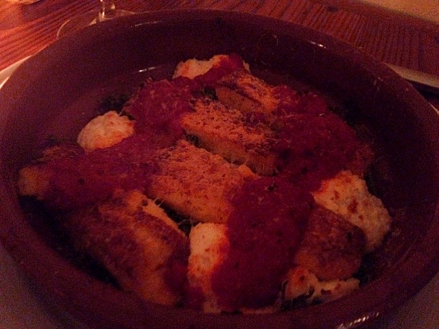 This dish came out a little weird. g ordered gnocchi. I saw it on the menu. I heard her order it. But this was more like rectangles of polenta in texture – very weird. I guess for polenta, it wasn’t bad, but when I think of gnocchi, I think of soft pillows of homogenous dough – not grainy/gritty pasta. It was accompanied by globs of ricotta and a tomato sauce and laid over a bed of something [that I didn’t taste], but I just couldn’t get over the gnocchi. g’s not one to complain [unless some really egregious error has been made], so she let it slide. I think that this was probably the biggest “pass” for me of the night – maybe someone doesn’t know their pasta? Or maybe they know their pasta too well, so that meager mortals like ourselves don’t know real gnocchi if it punched us in the face …