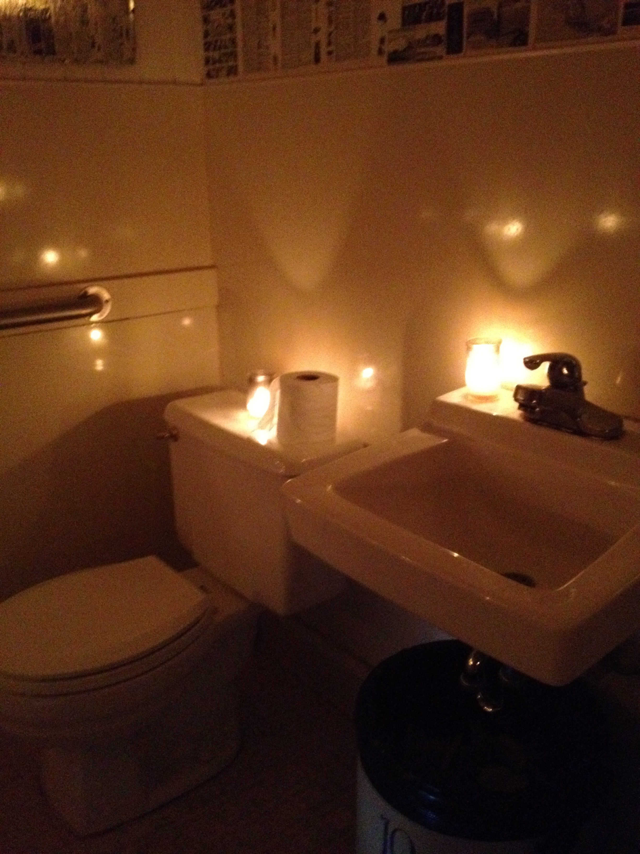 - So then I knew it was weird. I mean this has to be some kind of violation. You can’t see it in the above picture, but that bar next to the toilet that people should rely on for balance in case they’re elderly or handicapped (or happen to fall in because someone left the seat up) – there’s candles on that, too. I’m all for ambience – trust me – but I just don’t see how anyone needs to be put in a romantic mood to void/evacuate/wash. Kinda weird …