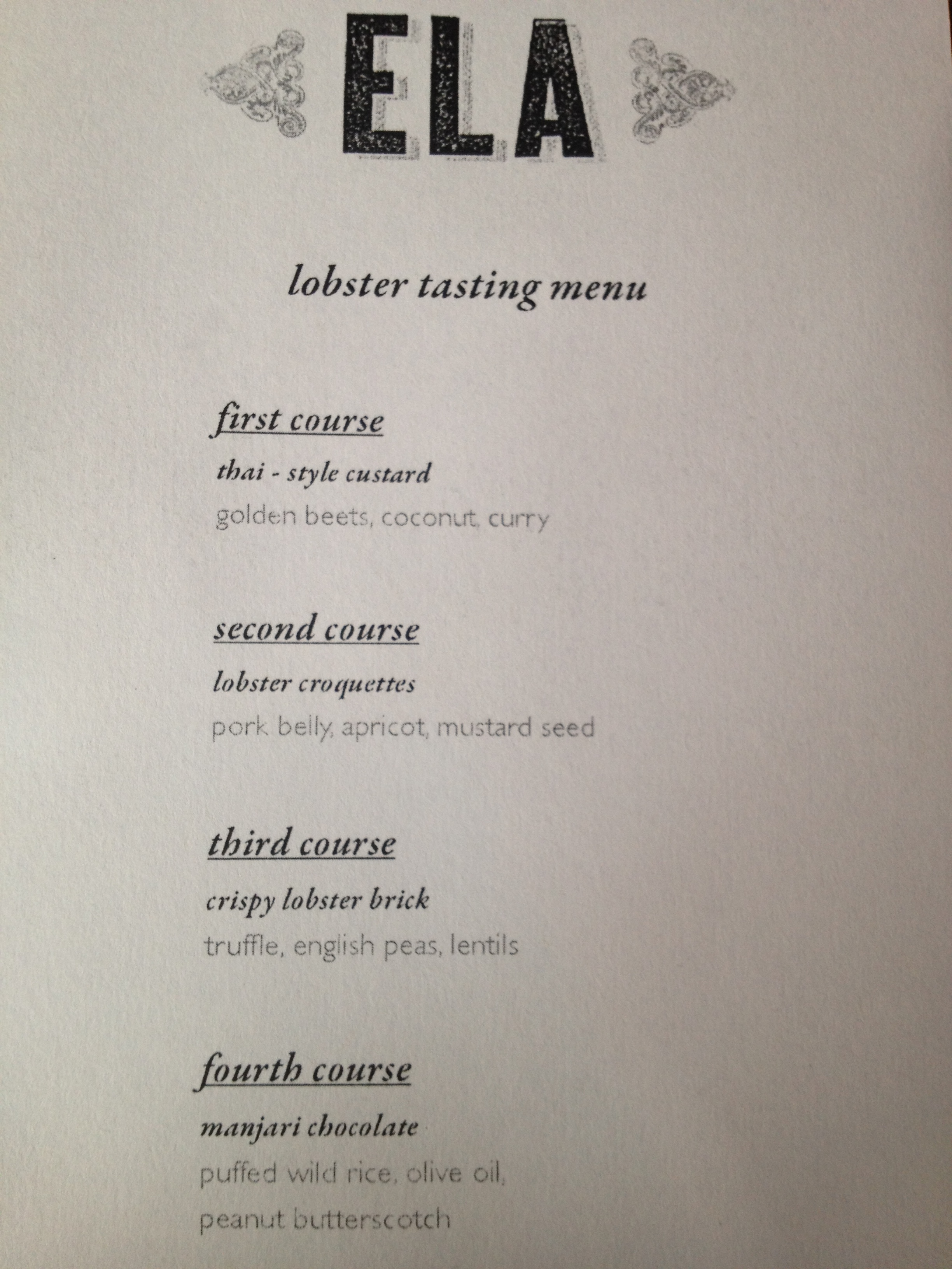 Mmmmm. Pork belly. I’m a sucker for pork belly … and have had it pretty much every place I’ve found it – maybe that makes me kind of a pork belly “expert” (or at least I could play one on TV). So how was Ela’s pork belly? I’d give it a “good”. Tender? Check. Flavorful? Smoky barbecue – check. But I prefer my belly a little juicier – perhaps deeply glazed or smothered or sauced. In this preparation, the pork belly was kind of naked … but that’s so it can pair with lobster, right? Kinda. I’m down with a lobster-pig combo, but something was a little off in this dish. The croquettes were breaded/fried, meaning they had a decent amount of fatty richness, already. Then when you add on the fat of the belly, the dish comes off a little “heavy”. The smears of sauce just couldn’t cut through it well enough. My wine attempted to, but was outmatched by the fat content of the food. As for the lobster flavor? Once again – it was a little lost with everything else going on – between the pig flavor, the mustard, and the sauces. I like where he intended to go but feel like he was blown off course a little bit …