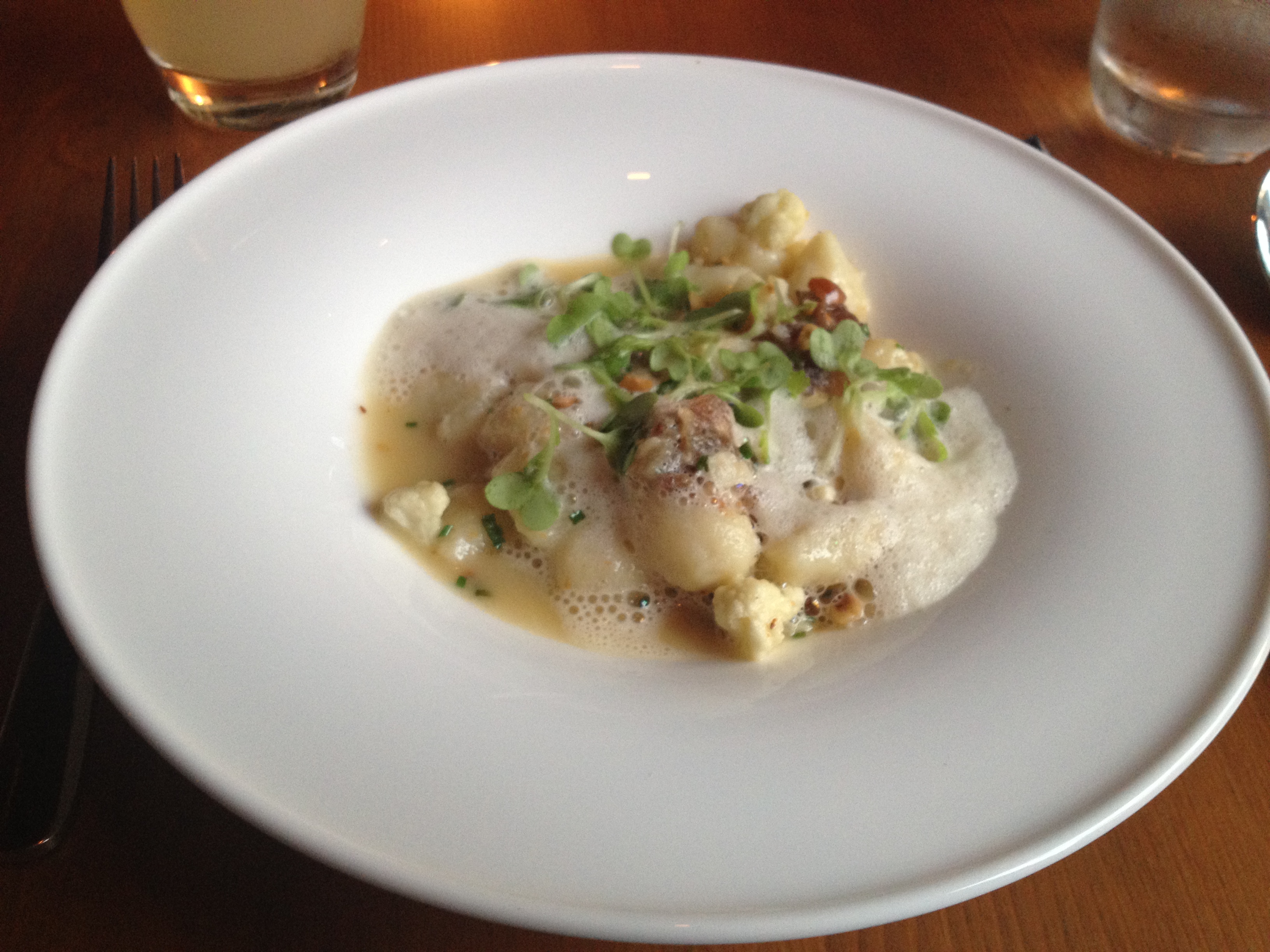 Welcome to the gnocchi. Not a visual stunner, but man-o-man, it was some mighty-fine, mighty-interesting gnocchi. The pasta was light and fluffy and kind of fun to eat with the similarly shaped cauliflower (you never knew what the cauliflower:gnocchi ratio was going to be), and the cheesy/creamy sauce/foam with the sweet, earthy hazelnuts was amazing. My tongue didn’t know what hit it. It’s got to be the dish of the night!