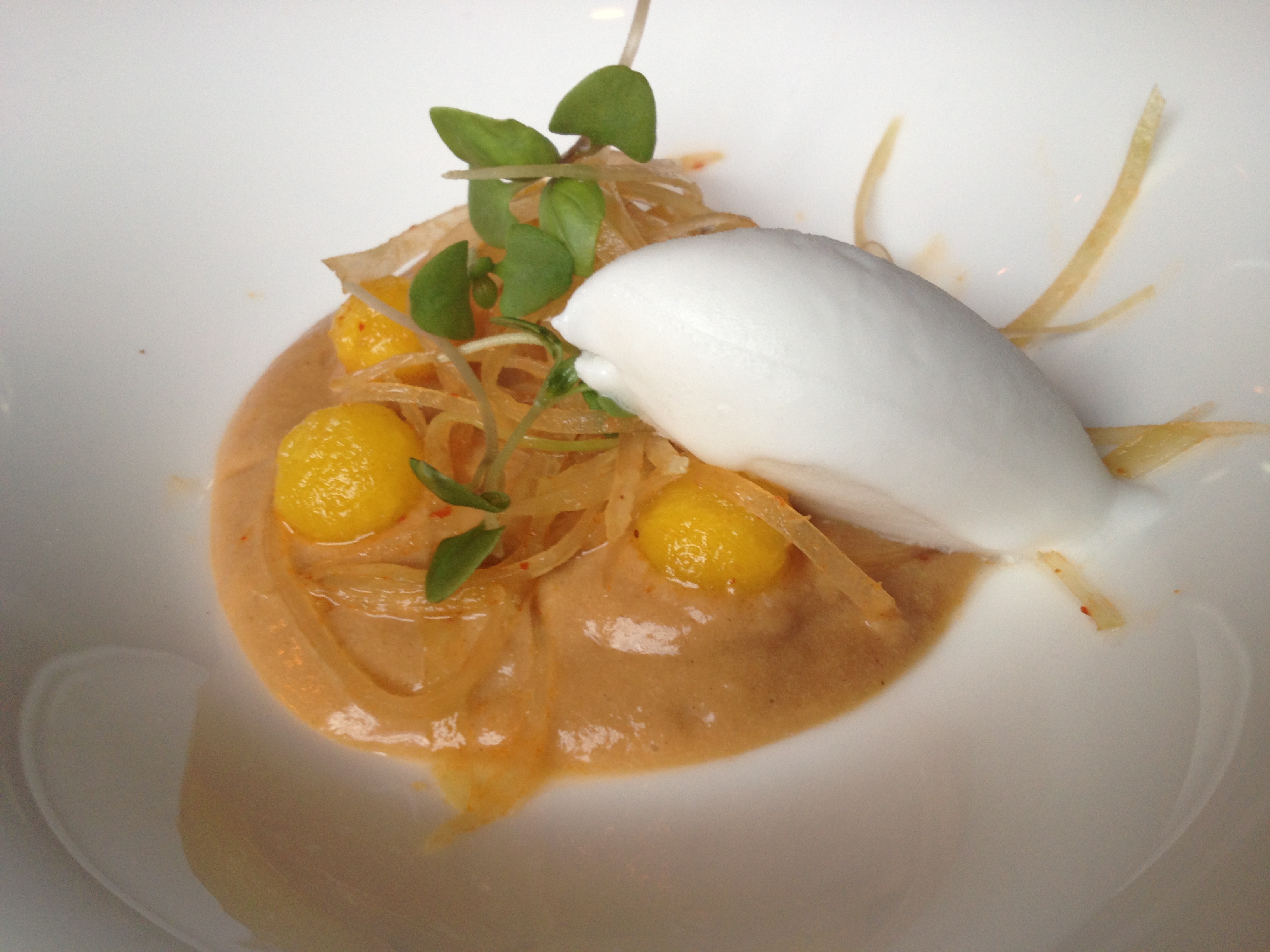 My first dish arrived and I was psyched – it’s been a while since I’ve had some good lobster. Scratch that – if you count the “lobster chicken“, then I guess I had it a couple weeks ago (but I’m not counting that). Let me start off by saying that nothing in this dish was bad – and as far as “curries” go, this was bright and lively, which I like. However, I felt that the lobster didn’t really have a place, as it was a little too subtle (I did get some lobster sweetness, but not much more than that) when compared to the punch of curry, the texture of the beets, and the cold of the ice cream (or was it ?sorbet?). The balance was a little off for my taste, as it felt more like a beet curry than a lobster one.