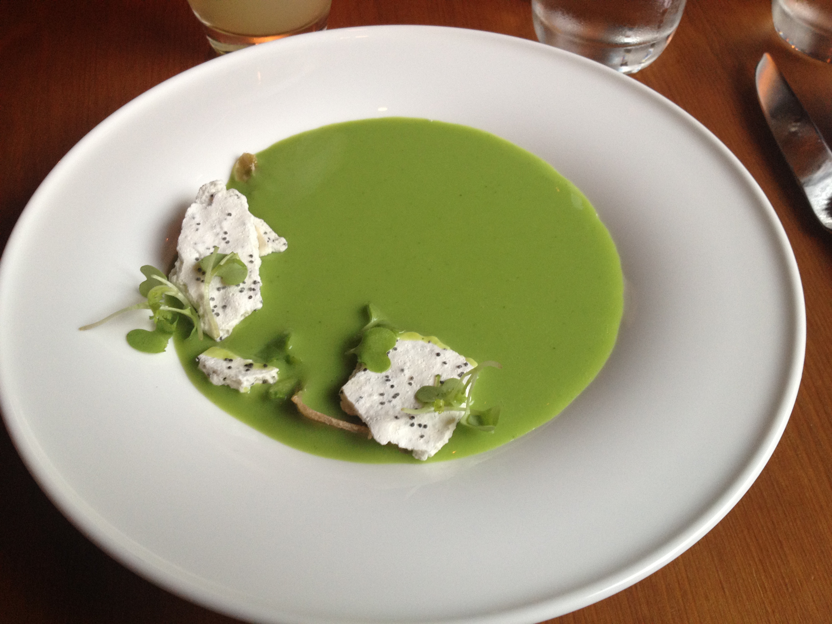 It’s hard to make pea soup look pretty in a picture – it looks like a puddle of green. At least we can say that it tasted for better than the photo makes it look. That poppy meringue and mint really livened up the deep pea flavors – it was a perfect accompaniment for a hot summer day (actually, I said at one point: “It makes me wish it was warmer in here just so I could really make use of how refreshing the soup is!”). It wasn’t life-changing, but definitely a solid start.