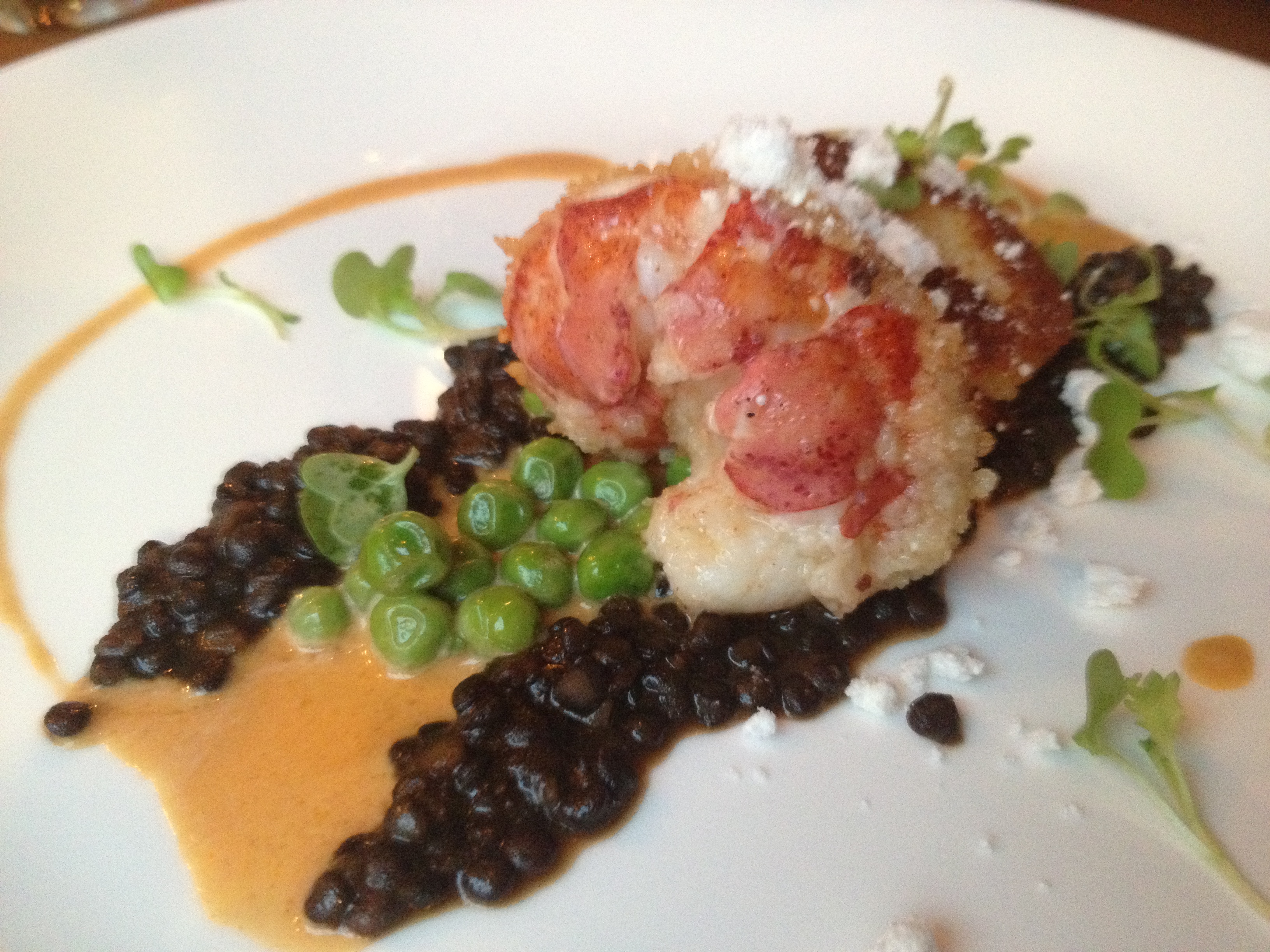 This was probably the best of the three lobster dishes. The hunks of lobster was nice – but to be honest, I thought he was going to meat-glue together some lobster so that the lobster would be presented as an actual brick (like Momofuku brick chicken). It wasn’t, but that’s ok. In this dish, I could finally feel the lobster taking center stage (or at least joining the front line with the other flavors), so I was happy. The lentils and peas still had a bit of bite to them, and the truffle powder was a great way to get the flavor onto the dish without overpowering the lobster or sauce – I’m a huge fan! My lobster was a wee bit over-cooked, but I was so happy to see an actual hunk of lobster that I didn’t mind.