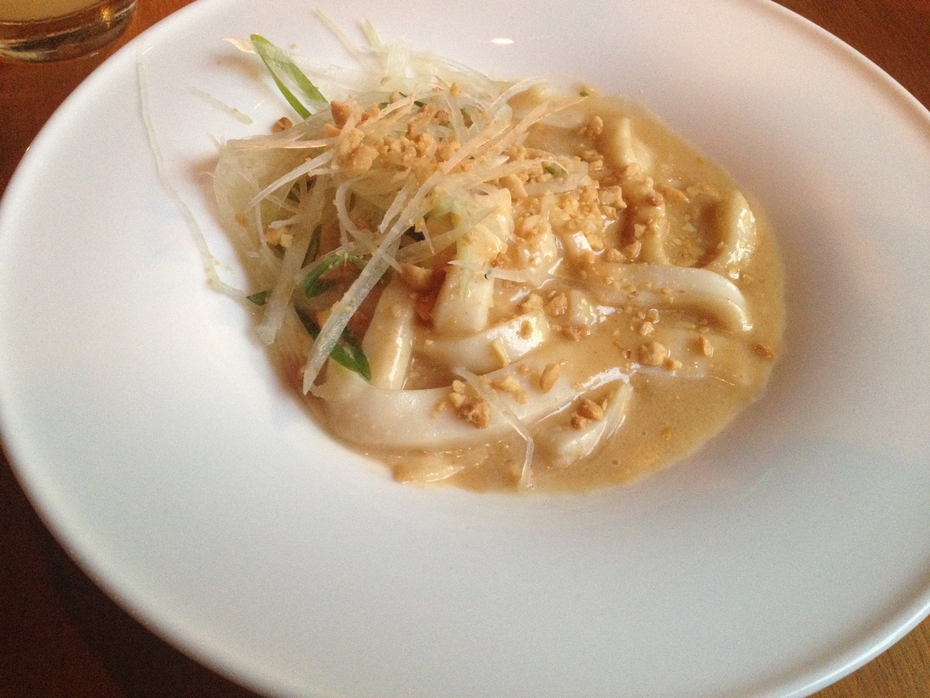 So this is the fabled dish that everyone talks about – the scallop noodles. Now, I understand the novelty – it’s noodles that are made of scallop – so that’s fun. But I think we need to put on our thinking caps before we praise this dish up and down for being “soooo good”. If this was a curry with plain ol’ scallops, would it be considered good? I’d say probably not. If these were normal scallops, you’d want to see some caramelization on them to bring in some deeper flavors, and not just the flavor/texture you get in the middle of a scallop. The curry, itself, was fine, but the sum of flavors was a little underwhelming. So it’s clear that this the dish relies on the novelty of the scallop noodles … but now let’s go back to the scallop noodles. Are they super-cool? Kinda. there’s a bit of mystique attached to them … that is … until I burst your bubbly and tell you how they’re made (or at least how I think they were made) – it didn’t involve sorcery, fancy cutting equipment, or ginormous scallops! Now, I’m no Ela cook, however, I’m 99% sure they were created in a manner similar to how Wylie Dufresne (of WD-50) makes shrimp noodles: transglutaminase! In short, transglutaminase is an enzyme that can be be used to chain together certain amino acids in proteins (that’s an oversimplification)! So if you have one slab of meat and another slab of meat, you could [in an oversimplified manner] throw on some transglutaminase and glue them together (although “glue” is a little misleading for what’s really going on here). What I suspect Ela did was puree some scallop, mix it with transglutaminase, and extrude it into the pasta shape of choice (once again – oversimplified). If this is true, then it’s not magic – it’s science. (Of course, if this is NOT how these are made, then I’m completely wrong and stupid, and I apologize to the Ela team for spreading lies.) So I guess what I’m trying to say is that if you just get around the idea of eating scallops in noodle form, I think most people would feel like dish needs a bit more going on in the flavor department …