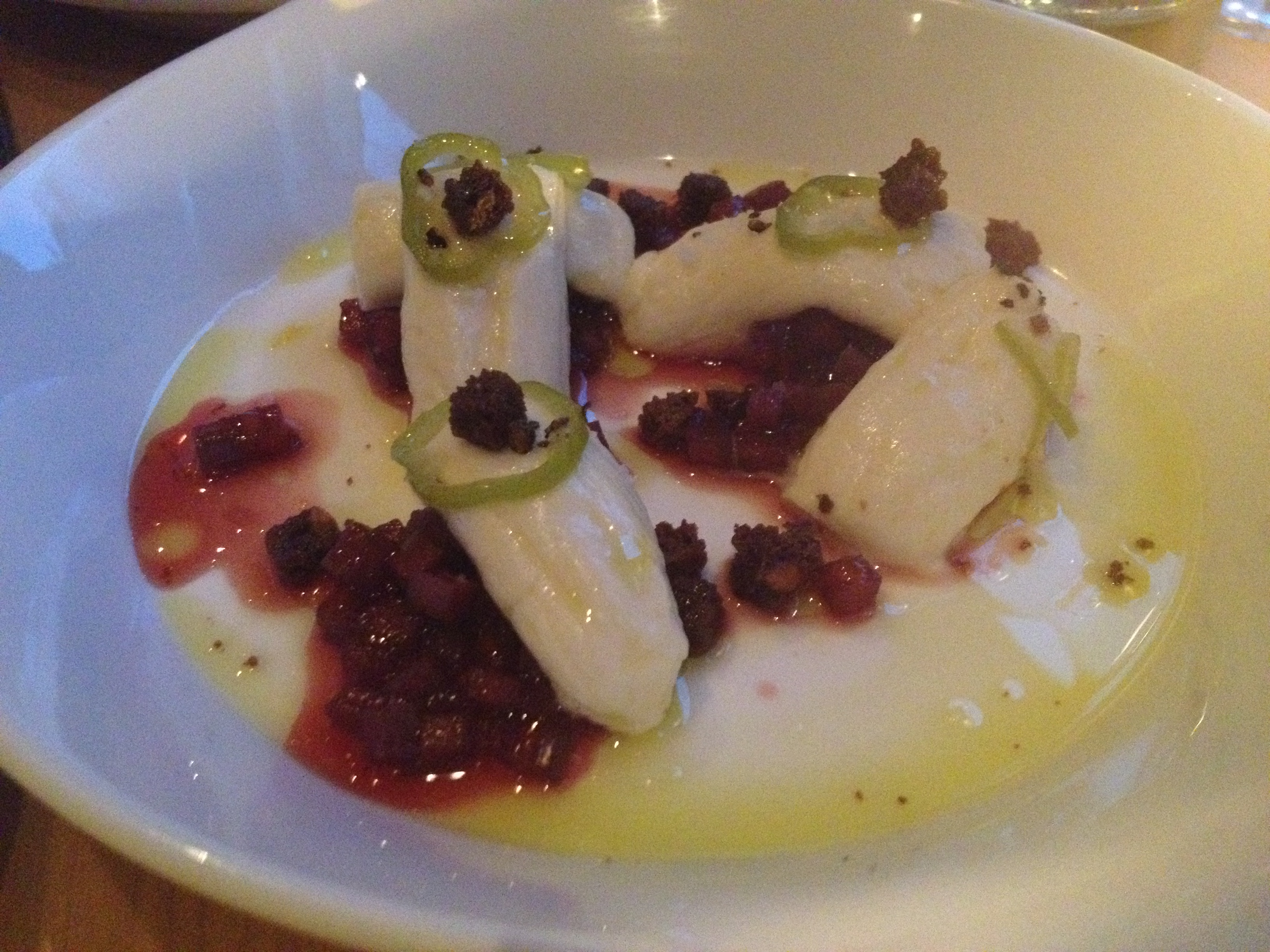 This was surprising, because this wasn’t some kind of rustic, bread-smearing mozzarella – this was a fancy mozzarella. It had this rhubarb sauce and that savory pumpernickely rye-twang – it was amazing … small … but amazing. Definitely one of those times when simplicity surprises you.