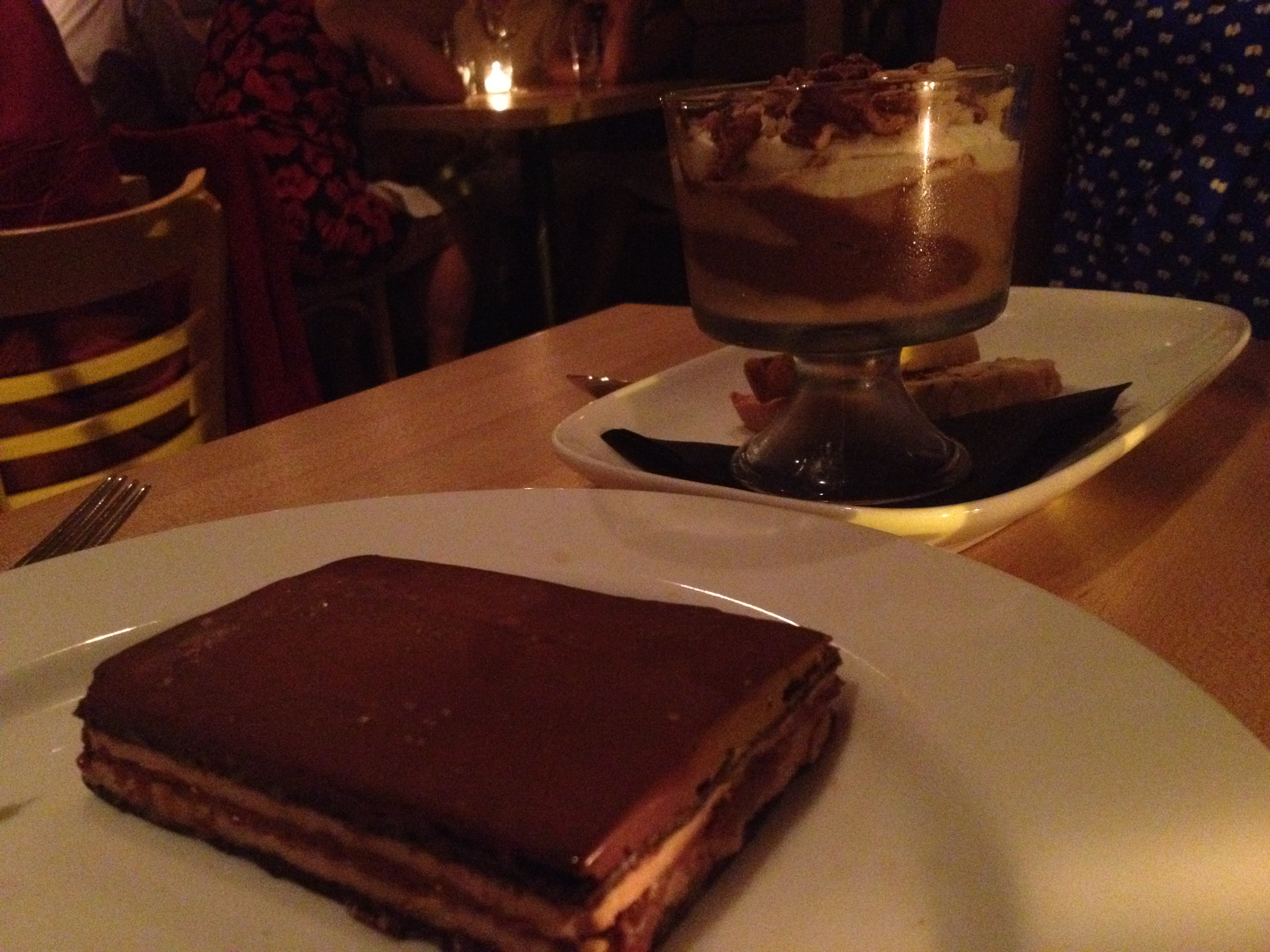 g, anticipating that I’d order dessert, arranged for both of their chocolatey desserts to come out at the end of the meal. (She reads me like a book.) They were actually quite substantial (we couldn’t finish ’em! and I tried really REALLY hard!). In the foreground is their version of a candy bar which was layers of chocolate (milk and dark?) and something hazlenutty and something crunchy – it reminded me of nutella … and like nutella, this was awesome. The butterscotch-chocolate parfait-ish dessert in the background was pretty good, but could have used some texture – maybe some graham on the bottom or something. Regardless, I was one happy camper with all that chocolate – g knows me through and through.