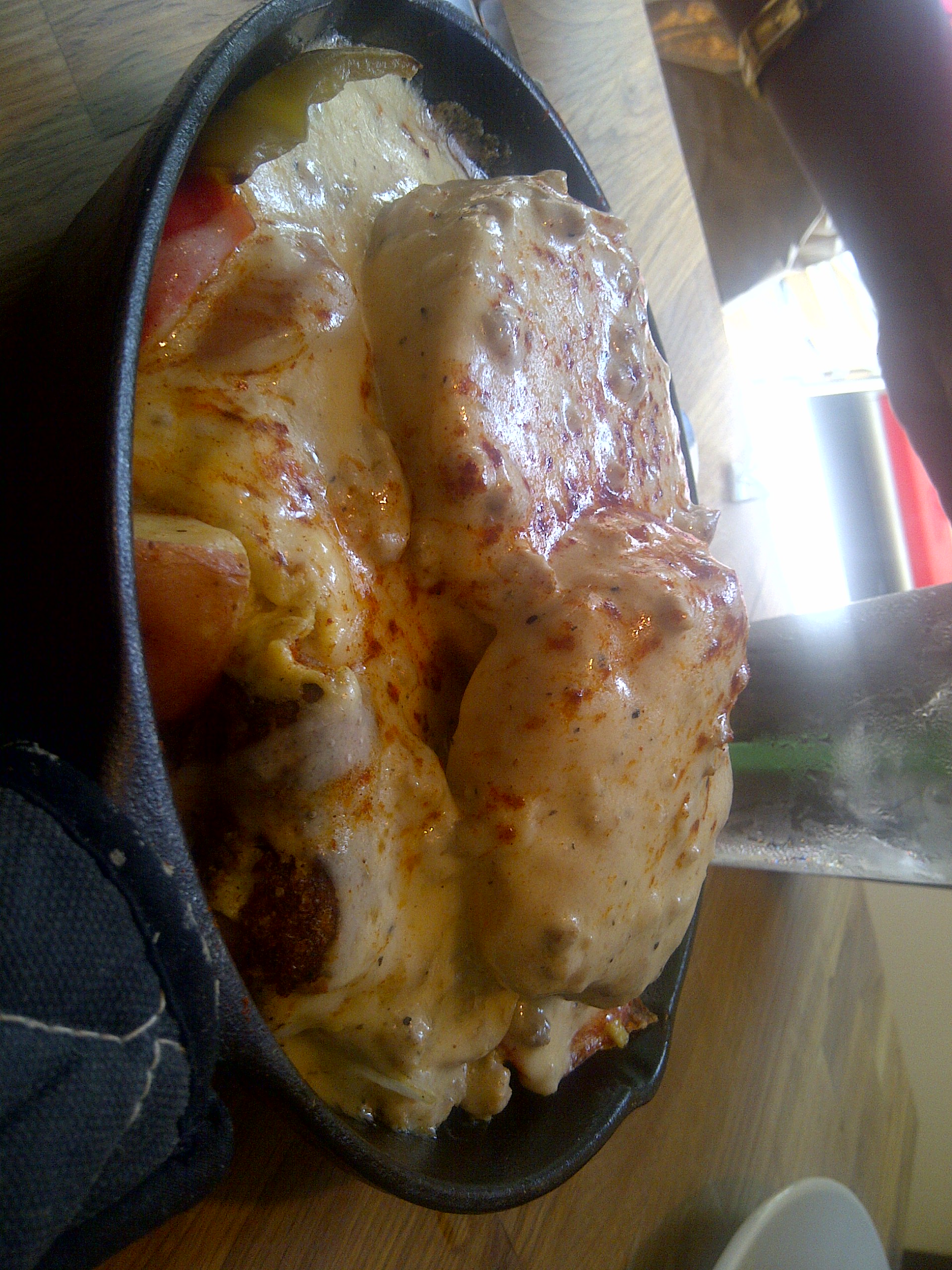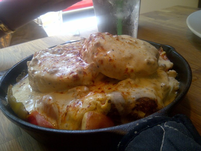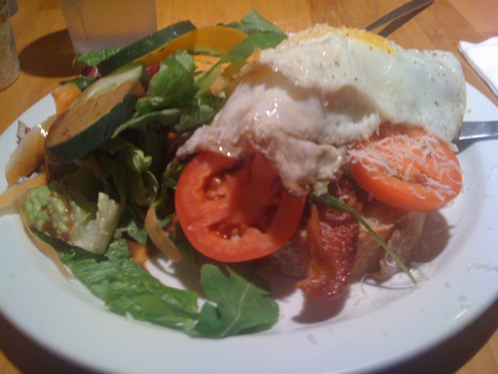 As you can see, it’s not actually that sexy-looking. On one hand, we can blame my photography – which is fair – I have no skills. We can blame the camera – which is fair – I’m still using an iPhone 3G (the 5 is coming … then booyah!). We can also blame the lack of bacon, however! I mean, if it’s the “bacon stack”, then surely there needs to be a large amount of stacked bacon, right? Apparently not. You can barely see the bacon! I think there were like 3 pieces on it … but they obviously weren’t the focus amidst the the salad and the tomatoes and the eggs. I mean, really, the bacon could just as well not have been there, as it was covered/masked by all the other stuff. So the balance of the overall dish was off. The eggs could have been seasoned more aggressively. The salad was unremarkable. The biscuit didn’t really have much flavor/texture. And then bacon … the bacon … it was just some plain ‘ol bacon – not particularly crisp, not particularly flavorful.