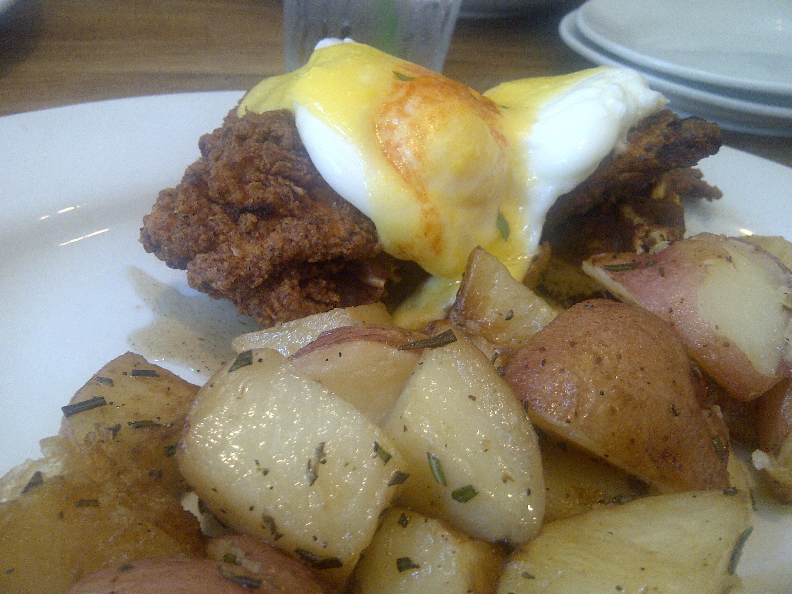 But it didn’t stop there. Green Eggs kept up the pressure with a wonderfully cooked Chicken and Waffles Benedict, with super-crisp-and-juicy chicken atop a waffle with a nice and runny poached egg (and crack potatoes … that’s what I’m calling them). And “the kitchen sink” looked outta-control: