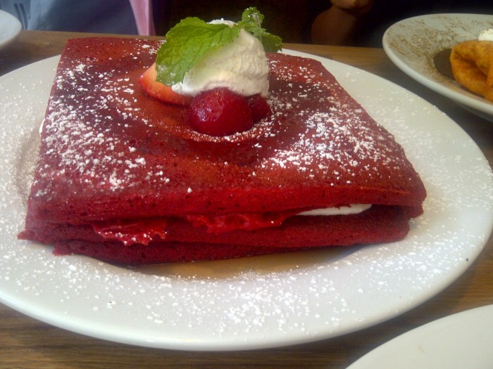 Green Eggs: August 2012, Monday Brunch, Party of 5. First things first: within 2 minutes of sitting down, it was decided that we split an order some of the “famous” red velvet pancakes for the table. Check it: