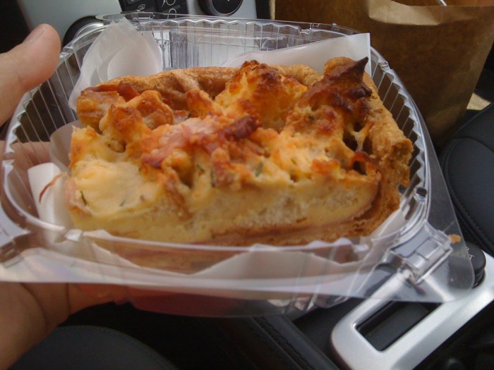 So my first slice of pie was a savory pie … you know … because I needed lunch. I have to confess that I was not particularly blown away with the ideas behind any of the listed flavors – but maybe it was because I couldn’t really conceptualize their pie counterparts. So I went with what I felt was going to be “an easy one”: croque monsieur. As you can see from above, this was far cooler than some kinda simple “French grilled ham and cheese”. First off, I half-expected the pie to come out kind of quiche-like, which for me, would have been awful (now why it is I would have ordered something that I half-expected expected to be awful, I don’t know). My problem with quiche: most quiches are often way too “eggy”, with not enough “stuff”. Fortunately, this was NO quiche. This was more similar to a super-roasted bread pudding (“super” because unlike normal bread pudding, there’s a nice dense crusting on top). So yes, there’s bread that had been soaked in some kind of cheesy mixture before the cooking process – maybe it involved eggs, maybe not. The point is that the end result is more bread-like than egg-like/custard. Hide in there a thin layer of ham, make sure it has that dense crust I mentioned on top, shove it all in a pie, and you get the result pictured above. Sounds simple, right? Sure. But it all came together wonderfully – at first bite, everything clicked: this was everything that a hot pocket wishes it was (But it was also everything a hot pocket isn’t). The ham and accompanying flavors were light and danced across the palate. There were little flirty tastes of ?mustard? and herbs. There wasn’t an molten, tongue-searing liquidy cheese leaking anywhere. I didn’t feel gross when I was done. And, to be honest, it was even easier to eat in one hand than a Hot Pocket (seriously, I just picked it up with one hand and began chomping it like I would a piece of thick-crust pizza). It was simple, but quite lovely. Of course, keep in mind that I’m apparently comparing this thing to a Hot Pocket and not a meal at a 4-bell restaurant; it is, after all, “only” a piece of pie.