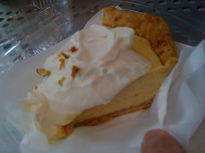 Then I attempted the lime custard pie with basil whip. I took a bite. Holy. Crapballs. What the hell was that? It tasted creamy and silky like a perfect custard should, but then the flirtacious lime came across, beckoning me to have another bite as soon as I could just so I could taste it again. But, if you held out (i.e. if you were fumbling with the fork and couldn’t quite shovel another bite into your mouth fast enough), you’d be rewarded by a breath of basil that’d tweak your brain into forgetting everything it ever knew about key lime pie. Yes, there’s a perfect crust that gives a nice salty backbone for the sweetness of the pie. Yes, there’s pistachio nuttiness. But this one’s about the flirtacious lime-basil. Actually, that’s dumb. It’s about everything – it’s all good. If I had to get hit in the face with a pie, I’d choose this one. (I like it very-nearly-as-much as our fave (Penza’s pies), but this one would hurt a whole lot less than getting hit in the face with one of those heavy-as-hell suckers.)
