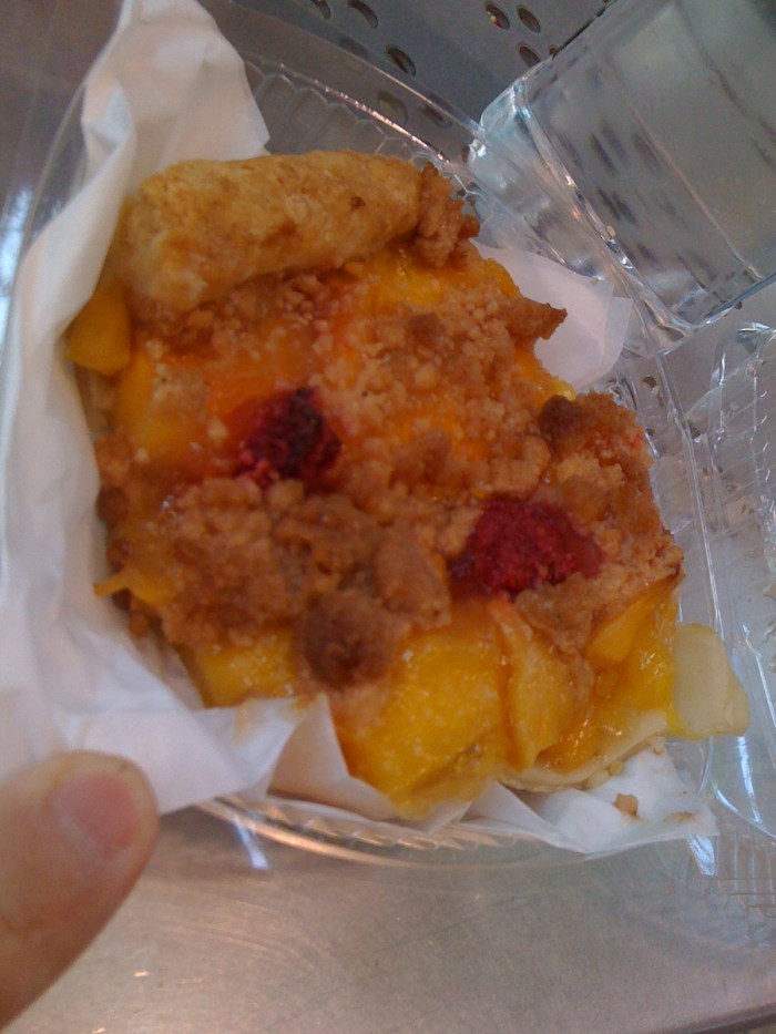 Now where there’s a winner, there’s also a loser. Meet your loser: orange blossom, peach, raspberry pie. It wins points for having an “interesting” flavor, most likely due to the orange blossom. As you bit into it, the super-sweet peach (it’s rich and thick like it came from a can, except without the metallic taste of canned peaches), but then you get this dose of roibis herbal tea, that kind of gives the pie some teeth amidst the cloying sweet. It was actually kind of fun. But that’s where the success stopped. The raspberries were kind of like an afterthought, stuck on top and unappealing to the eyes (and tongue). The crumb was mushy. The bottom crust was mushy. There just wasn’t enough structure or savory to compete with the powerful peaches. A Penza’s fruit pie would destroy this one, orange blossoms be damned.
