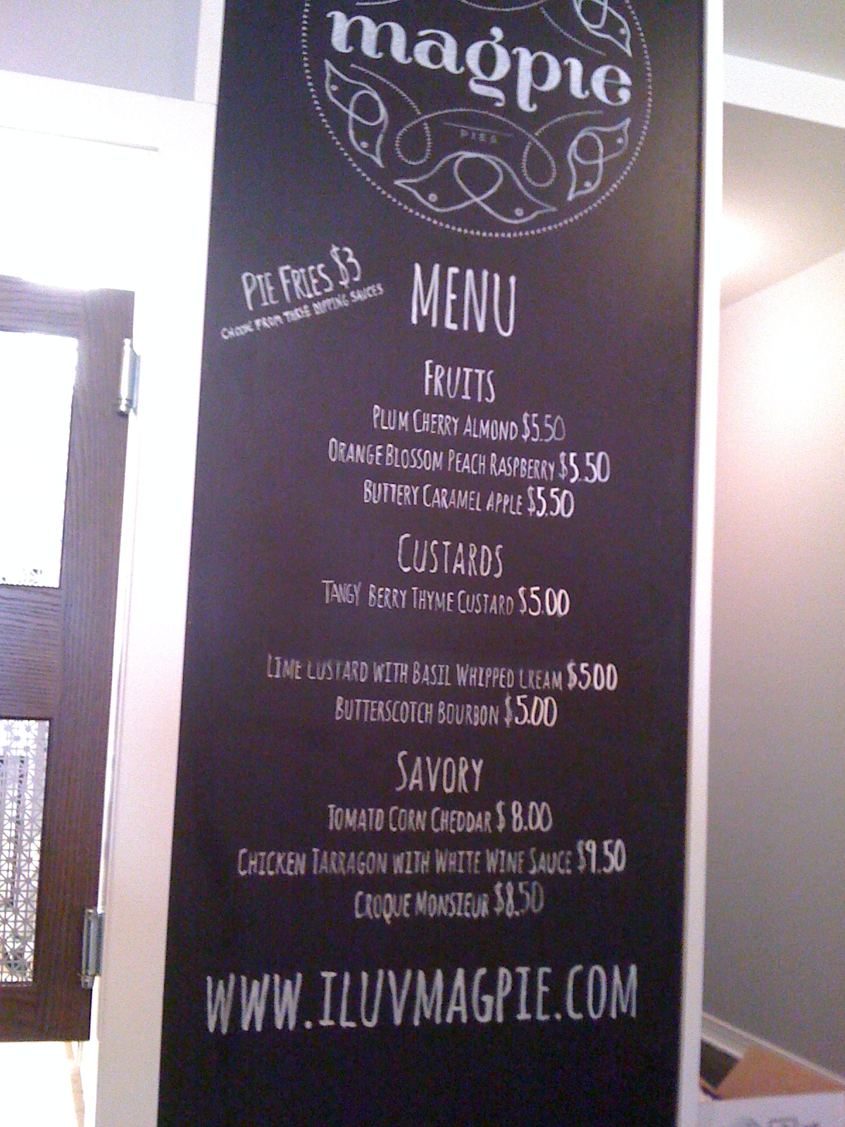 t says: For my last day of my staycation, I needed to do something “new”. g was working so it’s not like I’m going to go to someplace super-uber-awesome without her, but I did want someplace that had potential for awesomeness that she wouldn’t mind missing out on. In short, I needed to find a new place for dessert. Scanning through old foobooz posts, I was reminded that Magpie opened. Hmmmm. Pies. Seems like something that g wouldn’t mind missing out on. And they had some savory pies, meaning I could go for lunch and dessert. And so off I went.