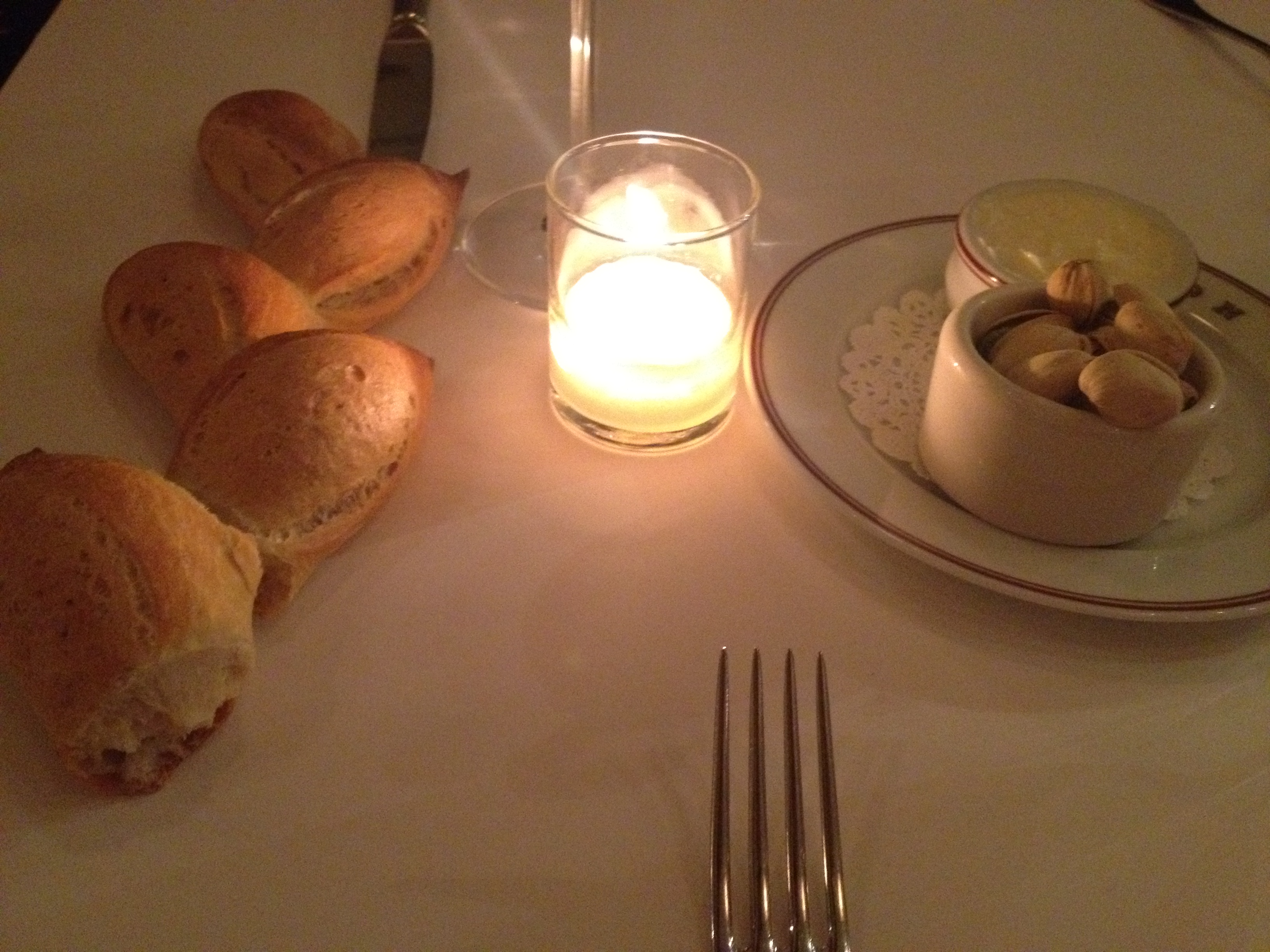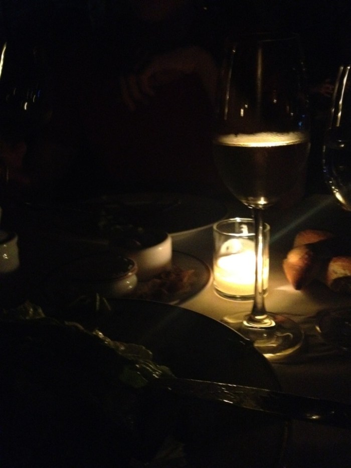 … but then the lights went out! At first it was very romantic. g made an astute observation, “this is kind of like our version of camping!” Yep – she’s right-on. In any case, the restaurant ultimately had to close down, cutting our meal short. At this point we had had our appetizers (I had an octopus appetizer that was actually quite rubbery – g’s salad was ok), and were kinda-sorta forced to eat our entree in the dark (after the lights went out, we were served our mains in the dark without being asked whether or not we’d like to continue dining). I have to say that I was a bit nonplussed about this experience and contemplated asking the manager if we could abandon our entrees (or at least mine – the gnocchi dish was actually not a great dish to eat in the dark), but he appeared very busy/preoocupied with all that was happening. We sucked it up, paid the full bill (they made no offers to comp anything and I was too irritated to raise a fuss), and walked out. Sorry Bouchon – two sad courses out of four and a disregard for patron’s dining experience … you get a D- (the good bread helps you evade an F) <g interrupts: Holy crap! You gave Bouchon a D-? I think that’s a little harsh!> back to t: Ok, then maybe a D … but the point is that it’s so not worth a Michelin Star or the tariff we paid. I did attempt to contact the restaurant to talk about the experience, but no response yet …