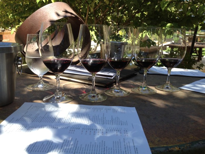 g and I elected for a tasting of a crap-ton of high-end cabernets. 5 in a row. Tasting notes include: “an immature teenage punk-rocker with tusseled hair”, “a classy alluring woman at a skinny black dress”, “a sexy vixen with whips and chains”, “raisins gone wild”, “a baby’s bottom”. End result: Kristine Ash’s offering (the vixen) and Tor’s offering (the baby’s bottom) were our favorite, with Tor getting the slight edge for grace.