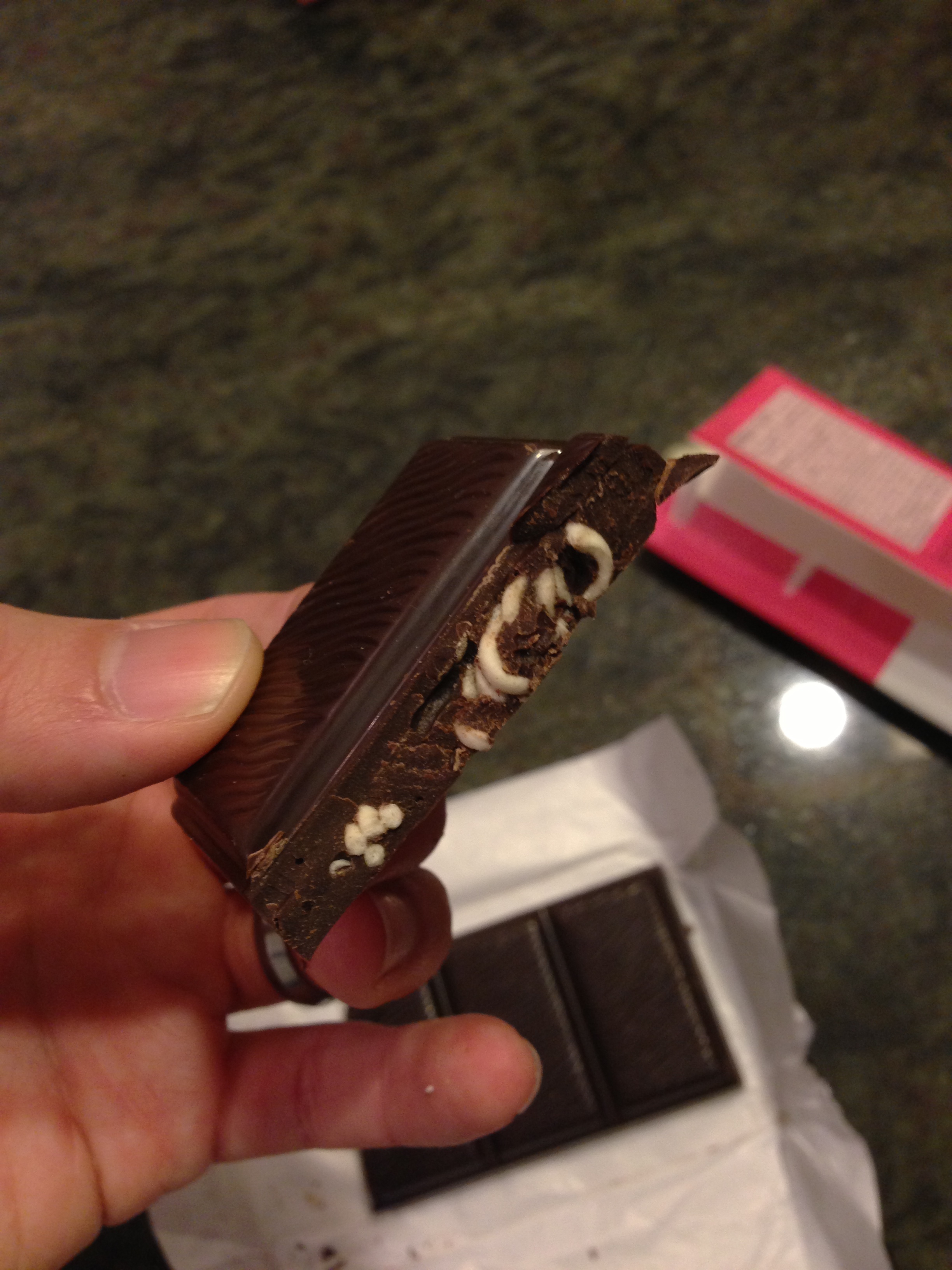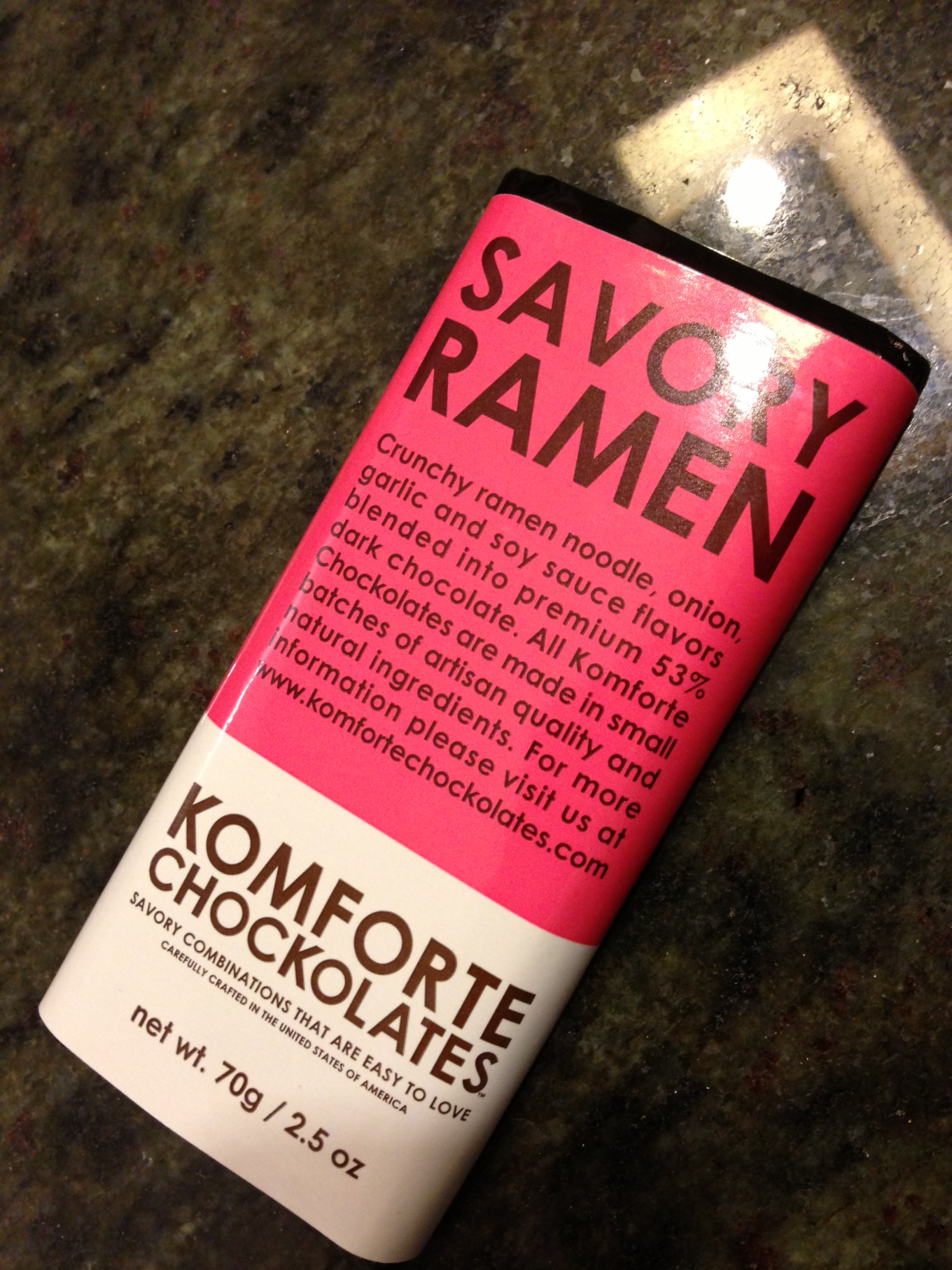 Yea, so I have a notorious sweet-tooth, so I like me some chocolate. Also, as you can remember, I also like ramen. So would the combination reward me with a sweet-savory one-two punch? Well … kinda … I enjoyed the flavor combination – the salty/earthy/umami of the ramen was fun with the not-too-bitter chocolate. But I just didn’t quite like the noodle bits – they added an awkward crunchiness that wasn’t as desireable as I had hoped. This is on contrast to nuts, which kinda crunch and go away; meanwhile, the raw noodles had this crackley-crunch that just kept going as the uncooked noodles broke down into smaller pieces of uncooked noodles. I don’t think I’ll be buying another one of these in the future, but I still think they’re worth a first try if you haven’t had one yet. Maybe buy it and share with three friends? (each bar is made of four blocks) – it’s worth the experience just so you can have an opinion.