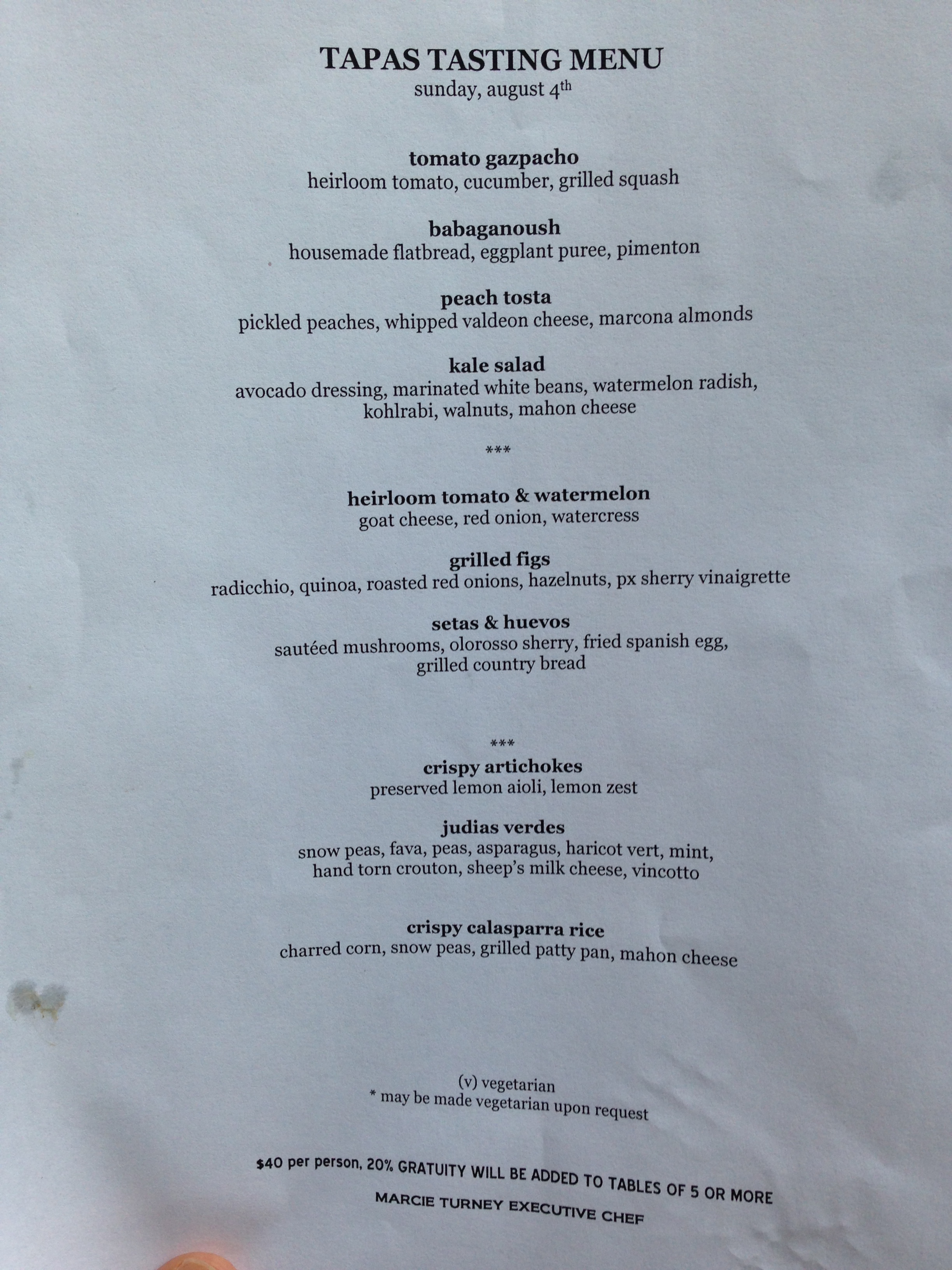 t says: Some time ago, g and kp and I went to Jamonera and were quite unhappy with it. Apparently, I had criticized one of their dishes by calling it a snoozefest (much like driving a Kia Cadenza) – yikes – I totally forgot about that – it’s a good thing we have this blog to remind us! Undeterred by my “cute hyperboles”, a and v journeyed out to 13th street to sample Jamonera’s vegetarian tasting menu … and were blown away! Check out their tasting menu for $40