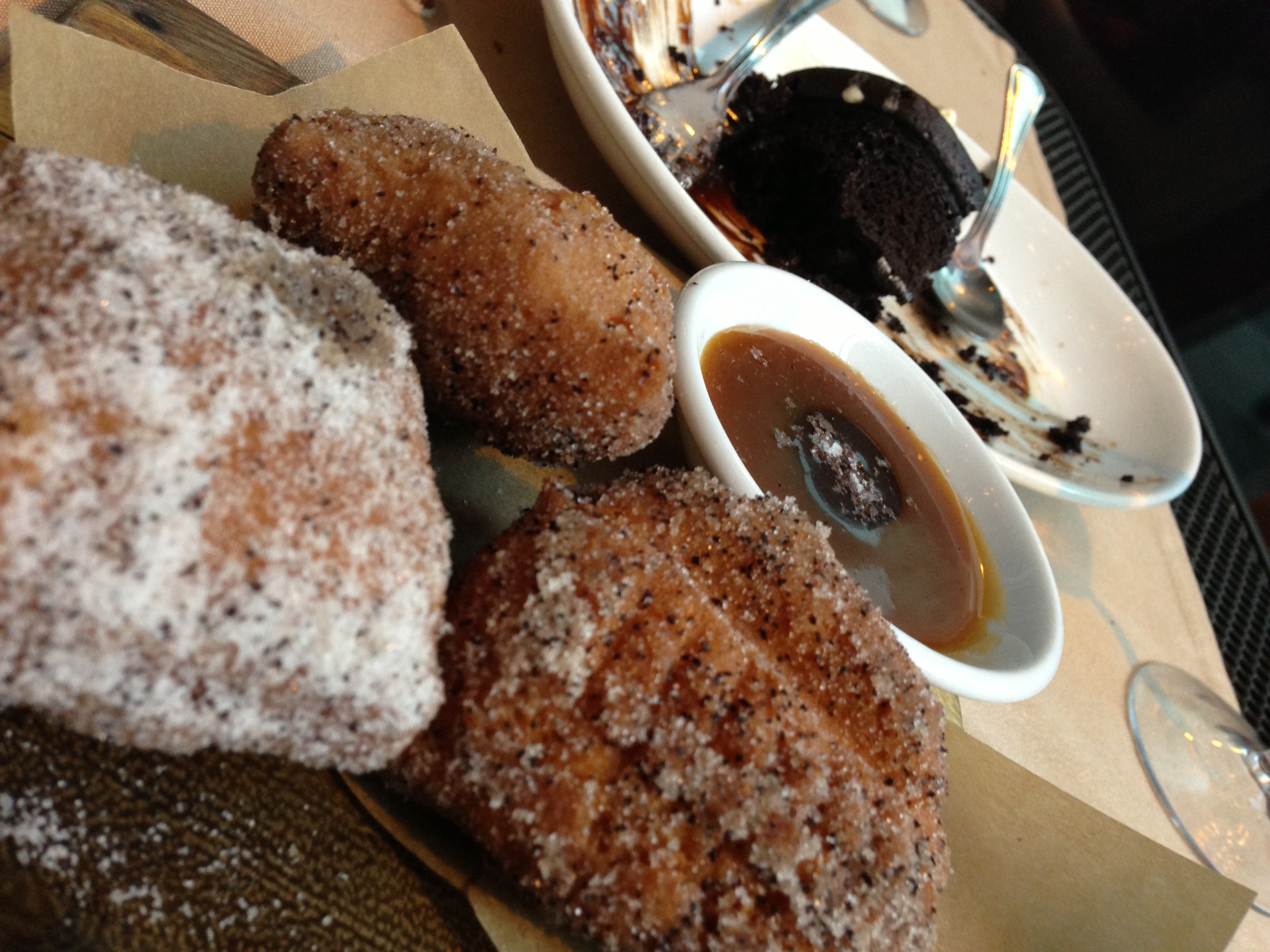 t says: when we went last time, we didn’t get dessert. Wow – we missed out on the best part! We sampled some of a & v’s this time, and they were out of this world. In the foreground above were some of the best fried dough I’ve had in Philly (with some beautiful caramel + ?chocolate? dipping sauce) …