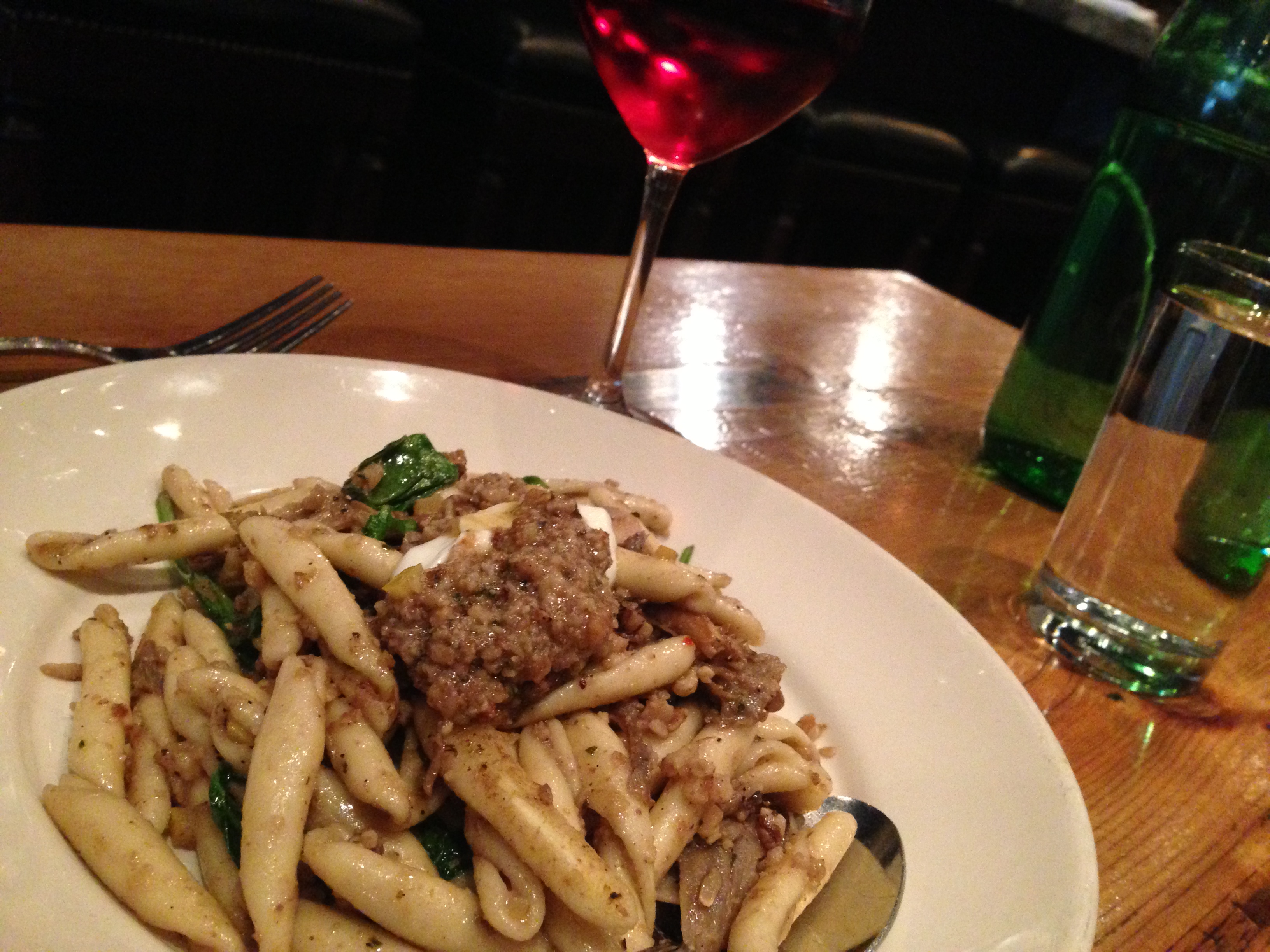 I first went to Barbuzzo for a lunch [by myself]. And while most might be afraid to eat alone in restaurant, I have no such fears if the food is good enough – and it was! I enjoyed a nice glass of rose of tempranillo, which had a good amount of spiciness and acidity to it, cutting through the richness of the mushroom and pesto and mozzarella pasta.