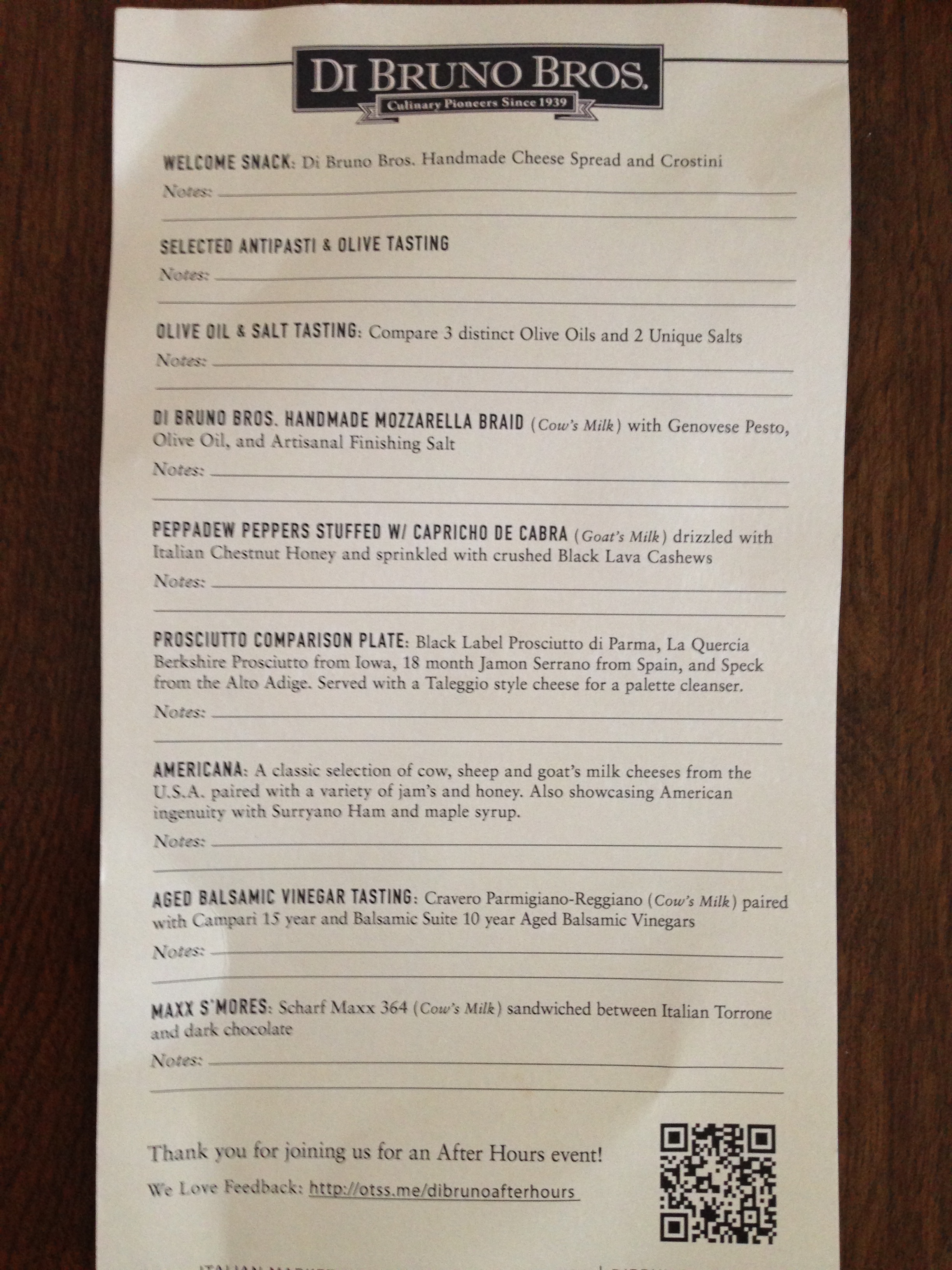 For those of you who only go to the CC location, the Italian Market one will feel cramped and small. But! It’s a great venue for one of these tastings, where you have several rounds of finger foods (antipasti, olive oils & salts, cheeses, charcuterie, dessert) and you’re allowed to taste anything you want in the store for no additional cost! No. For real. Anything. And it doesn’t have to be “planned” ahead of time. Like v totally asked off the cuff, “can I try some pate?” and boom – 90 seconds later we had a head-to-head pate tasting. After seeing this, I kinda went a little “high-maintenance” and just started picking out random expensive things to try. For example – a $30/lb cheese? Yes I’ll try that! Jamon Iberico that’s $130/lb? We’ll have a sample for everyone please! The only thing they didn’t let us do was operate the meat slicer … But I have to say that as much fun as it was to pick out things to try, the pre-set courses that were coming out were also no slouches, either! Between the surprisingly-good prosciutto they had (it was like prosciutto 2.0 – twice the flavor!) and the “cheesecake” dessert (they topped a wedge of Delice de Bourgogne with some cherries and stuck a candle in it, and voila! Instant savory birthday “cake”), we were wow’d at every turn. I don’t have many pictures to show because they reveal our identities, but what I do have a picture of is this: