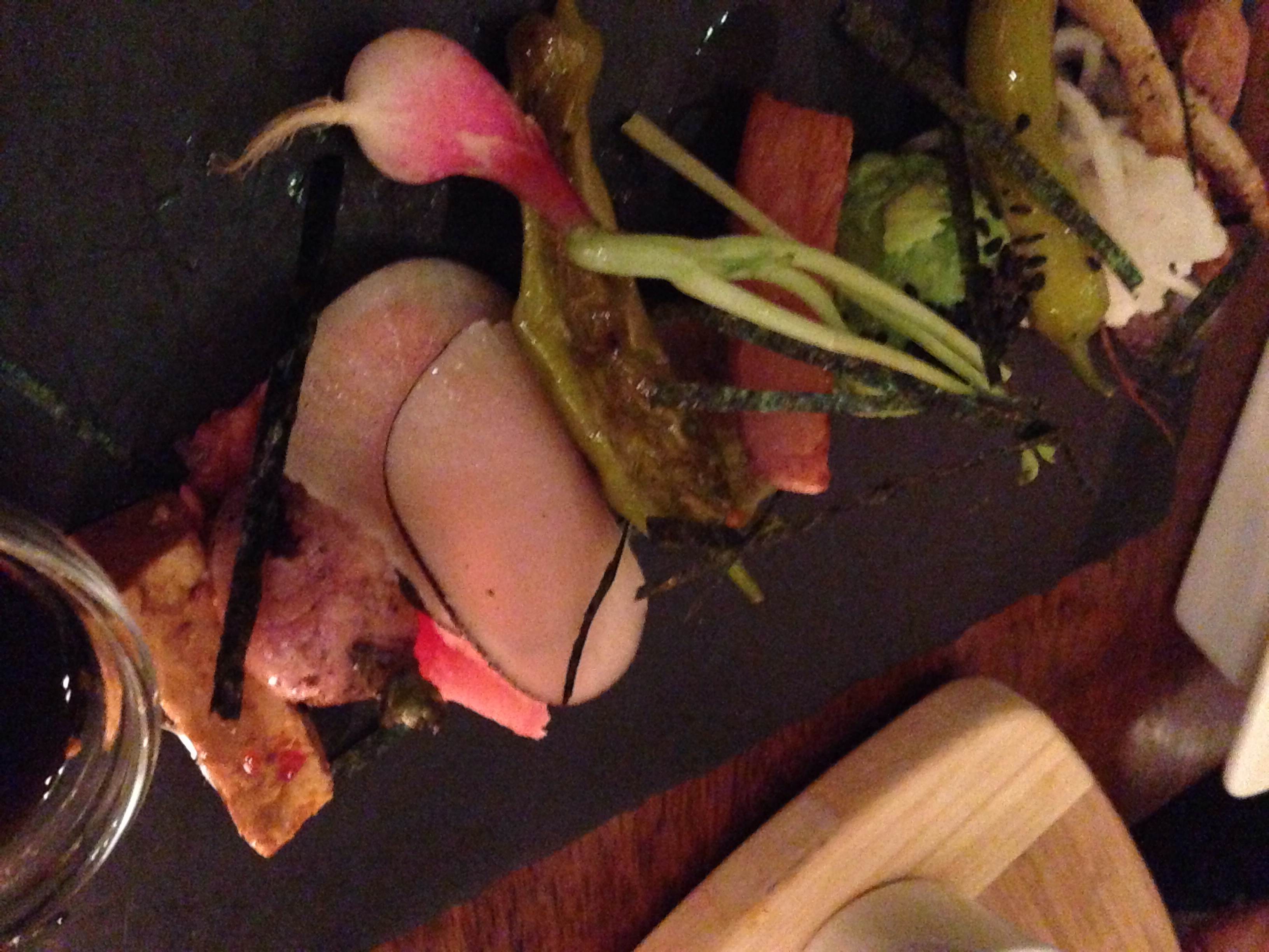 “fancy radishes”: this was an amazing array of radishes that is photographed extraordinarily poorly. I have to say that I did not think I could possibly enjoy radishes this much – but I can see why this dish is often compared to a sashimi platter in terms of its beauty. The leg up that it has over sashimi is that the textural differences between the different radishes and preparations are all over the place – so it was quite the adventure! (not that raw fish don’t have different textures …) This one probably wins my award for best dish of the evening.