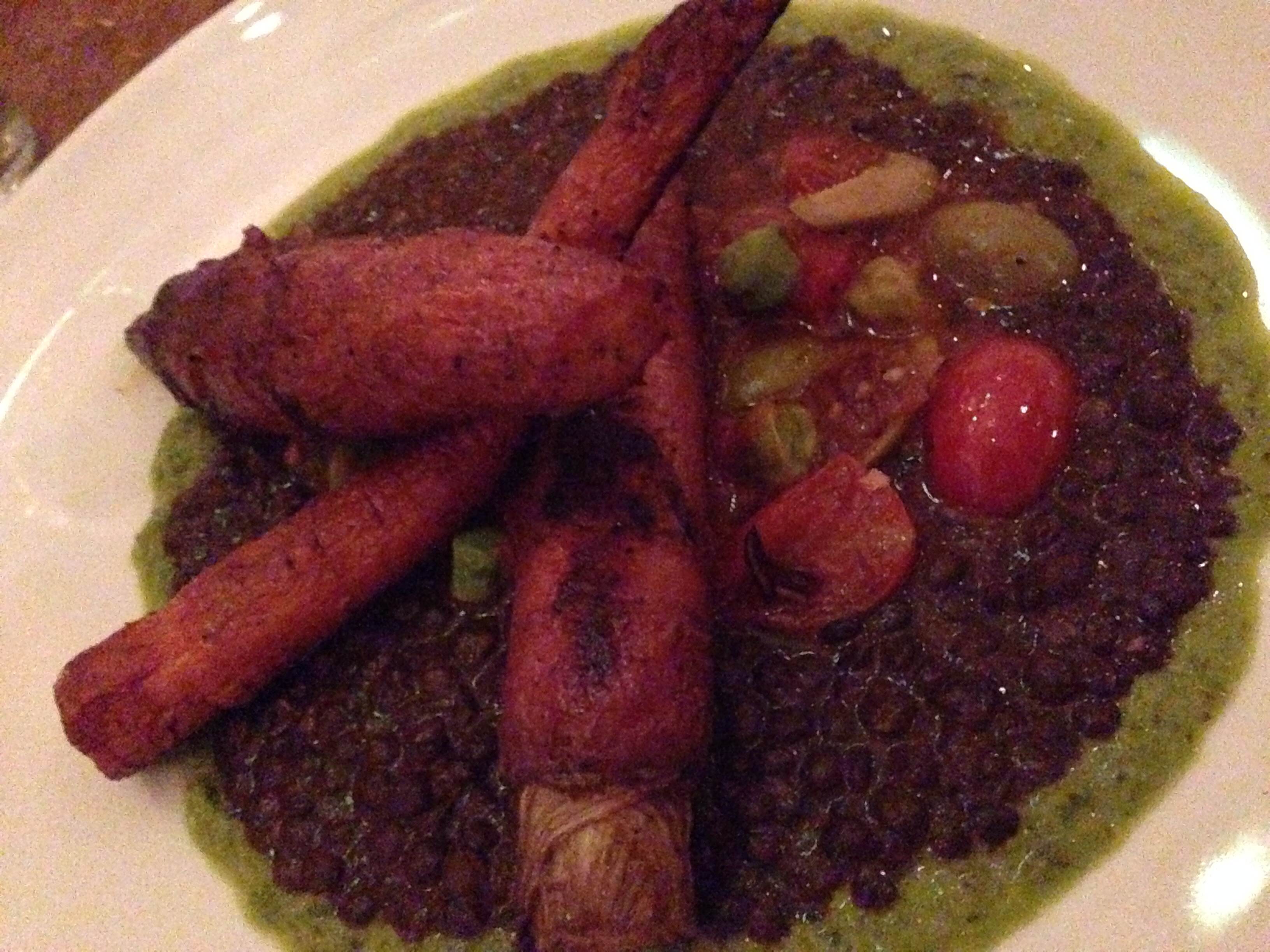 carrot: I often joke about vedge, saying “why would I want to eat a carrot for dinner?” And this is the answer: carrots “shwarma style”. I have no idea what “shwarma style” means, but I know this carrot was nicely seasoned and served with some black lentils that g just could not get enough of! For me, I dock it some points because I’m not a carrot fan (I’m not sure that’s fair but I don’t care), but as far as carrot goes, the texture was beautiful and the non-carrot flavors were right-on … BUT … I couldn’t help but wish the carrot was replaced with a piece of pork belly/shoulder/cheek.