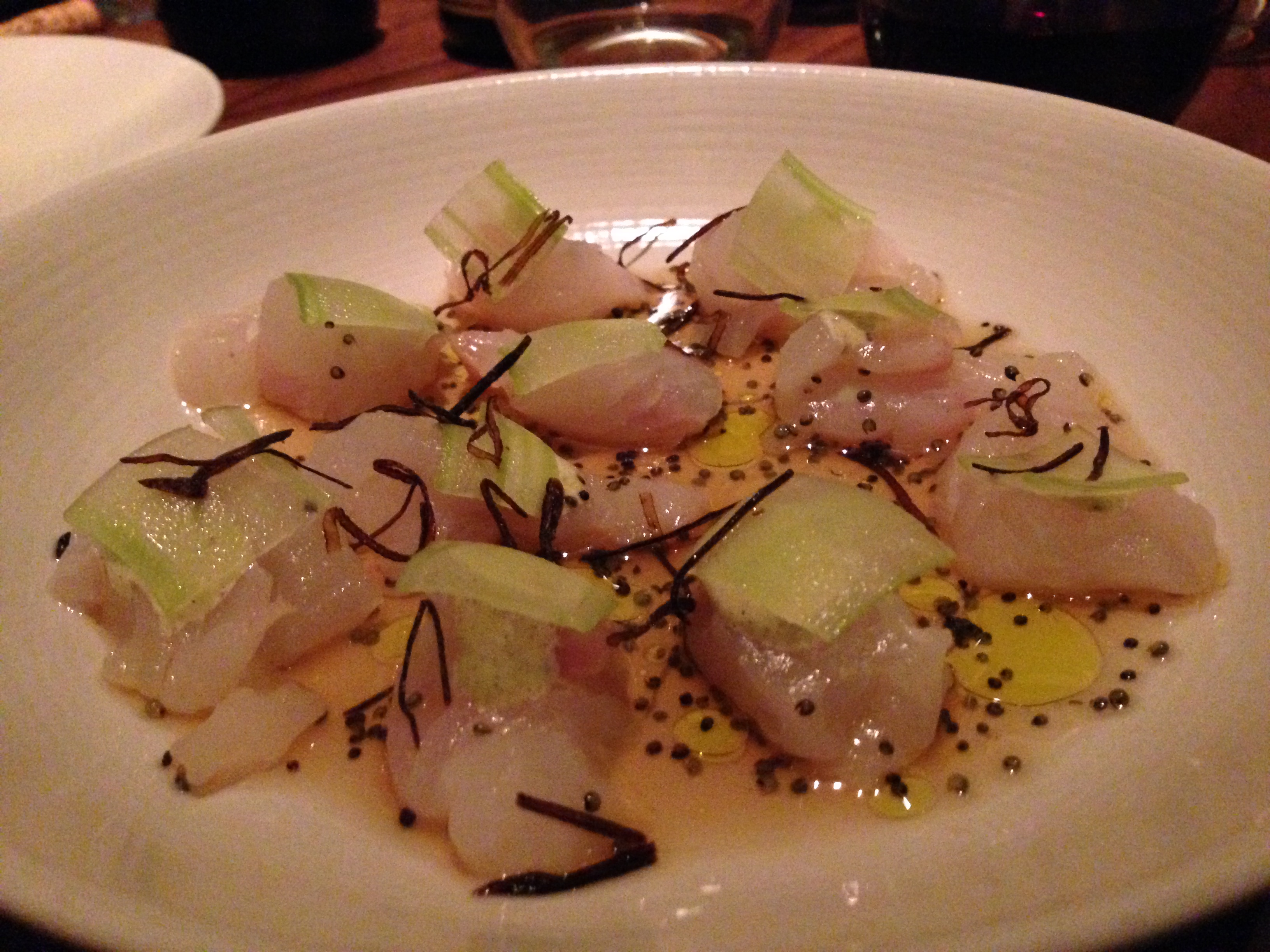 t says: But I think we all agree that out of all the appetizers, none could not match the raw fluke crudo. g comes from nowhere: I’ll say it again – I love it when someone knows what to do with cucumber. a agrees: Yea – it’s my new flavor of the month. t says: So if you have to have just one appetizer, we cannot speak more highly about any than the fluke crudo – it just hits all the right notes …